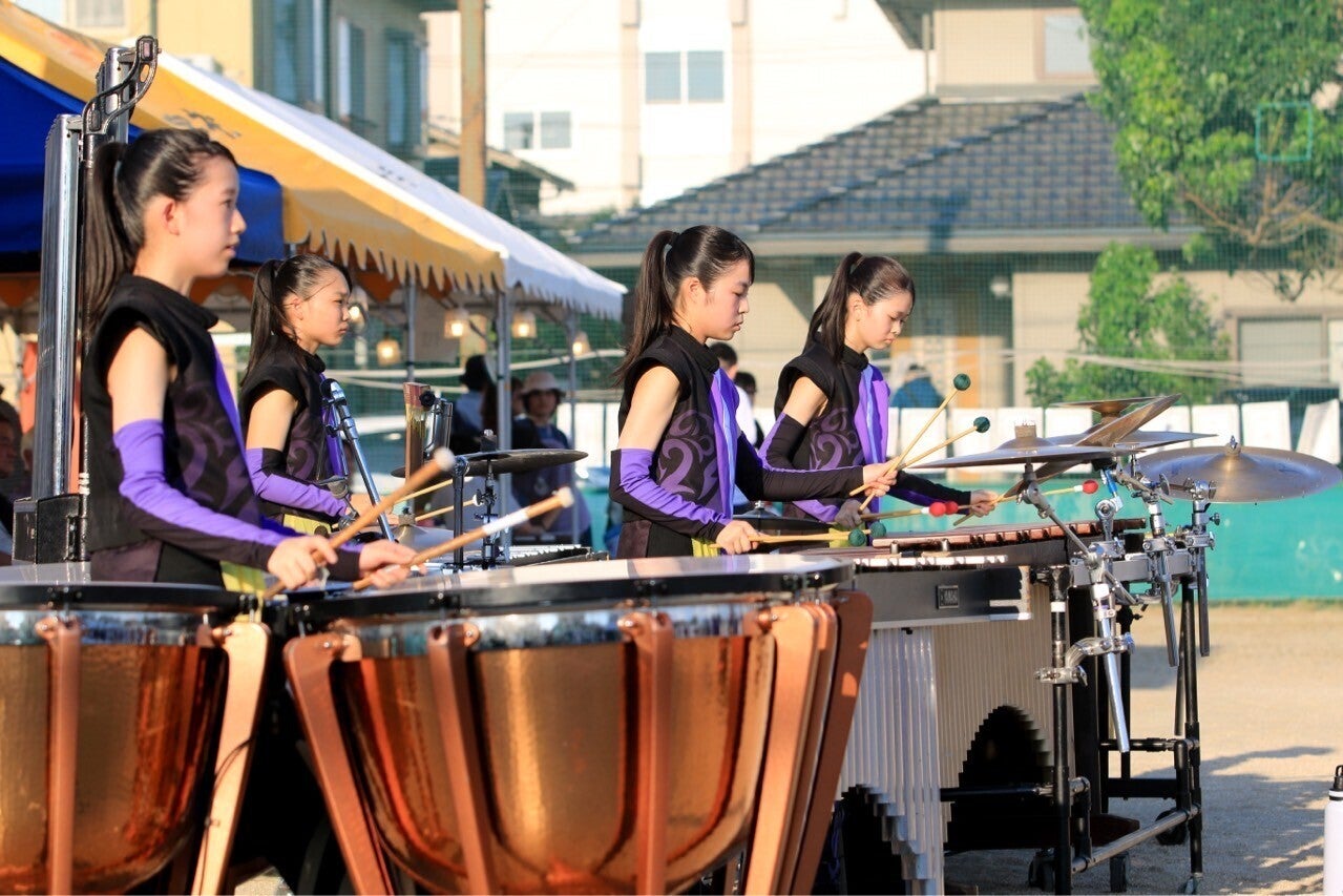夏には多くの地域の納涼祭に参加し、照り返す太陽のもと軽やかな音楽と華麗な演技、そして暑さにも負けない笑顔で地域を明るく盛り上げています。地域の皆様からは多様なご支援と演奏の場をご提供いただき感謝しています。