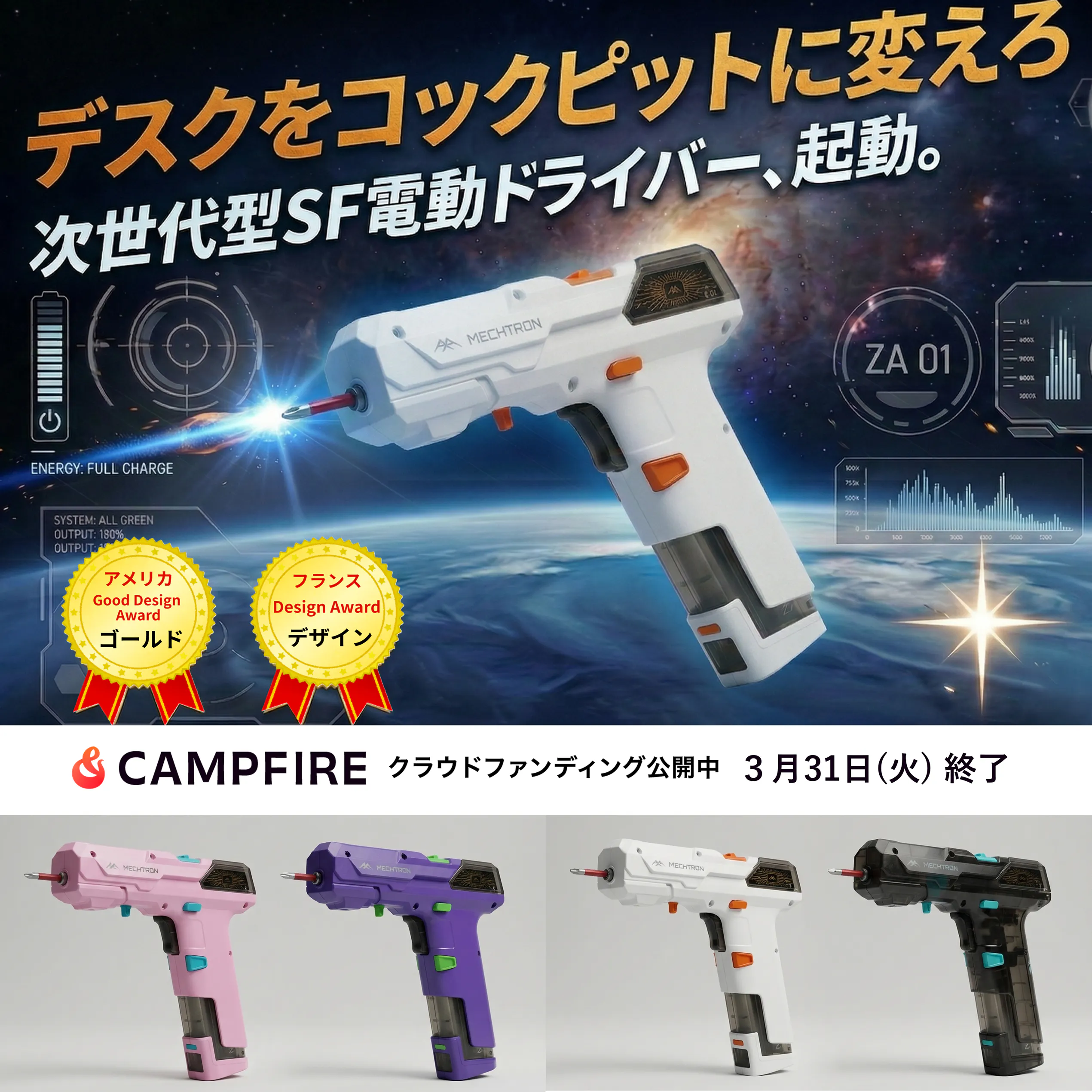2026/03/16 09:59活動報告をご覧いただき、ありがとうございます! 「DIY工具はエンターテインメントへ。大人の遊び心満載、デスクを飾る電動ドライバー。」 プロジェクトオーナーの若狭 宣浩です。皆様の熱い応援のおかげで、支援総額はついに「80万円」を突破いたしました!ひとつひとつのご支援、そして温かいコメントに、毎日胸を熱くしております。本当にありがとうございます!■ ついに「ピンク」のYouTube動画を解禁!これまで「音」の魅力をお伝えするために、ホワイト、ブラック、パープルの動画を公開してきましたが、ついに「ピンク」の機体もYouTubeへ投入しました。今回のテーマは、「見た目とパワーのギャップ」です。 「かわいいからパワーは弱そう……」そんな常識を、かまぼこ板と一緒にぶち抜く快感動画をぜひご覧ください!◎ ピンク:【衝撃】かわいいピンクが「板」をぶち抜く快感https://www.youtube.com/shorts/WqUMpGDCDVI◎ ホワイト:清潔感あふれる未来感https://youtube.com/shorts/1cFtIvP6hT8◎ クリアブラック:重厚でタクティカルな「男のロマン」https://www.youtube.com/shorts/Jy8u7i7heXE◎ パープル:覚醒の一台。「ロックオン」したくなる世界観https://youtube.com/shorts/t546o5Syijc■ オプションキット「ドリルビット」の内容動画を見て、「ピンクでドリルができるの?」と驚かれた方も多いのではないでしょうか。 実は、アクセサリーキットに含まれる5本のドリルビットには、用途に合わせて3つのカラー設定があるんです。素材に合わせて色分けされており、直感的な選択が可能です。 ▼ ブラック(2本):3.5 / 4.5 ㎜ (木材用の穴あけ用)木工用動画でかまぼこ板を抜いているのがこちら。木材への穴あけに最適です。▼ゴールド(3本):3.5 / 4.0 / 4.5 ㎜(鉄板やアルミへの穴あけ用)金属用アルミや薄い鉄板など、金属へのアプローチにはこのゴールドを。▼シルバー(1本):6.0 ㎜(壁へのアンカー打ち用)コンクリート用レンガやタイルなど、硬い素材への穴あけに対応したタフな1本です。「電動ドライバー」でありながら、これだけの「ドリル性能」を秘めているのがMechtronの凄さ。ぜひアクセサリーキットと併せて、その実力を体感してください!■ 一番人気の35%OFF、残り【13台】です!現在、超超早割35%OFF枠が、いよいよ残り【13台】となりました。 動画公開以来、パープルとピンクへの注目度が急上昇しております。「どの色にしようか」と迷われている方は、ぜひお早めに確保してくださいね!■ 最後にお願いまだ検討中という方も、ぜひページ右上の「お気に入り(ハート)」をポチッと押して、私たちの挑戦を見守っていただけると大きな励みになります。これからも、Mechtron|G1Liteを通じた「新しいワクワク」を全力でお届けしてまいります!ガラパゴススタイル 若狭 宣浩 もっと見る