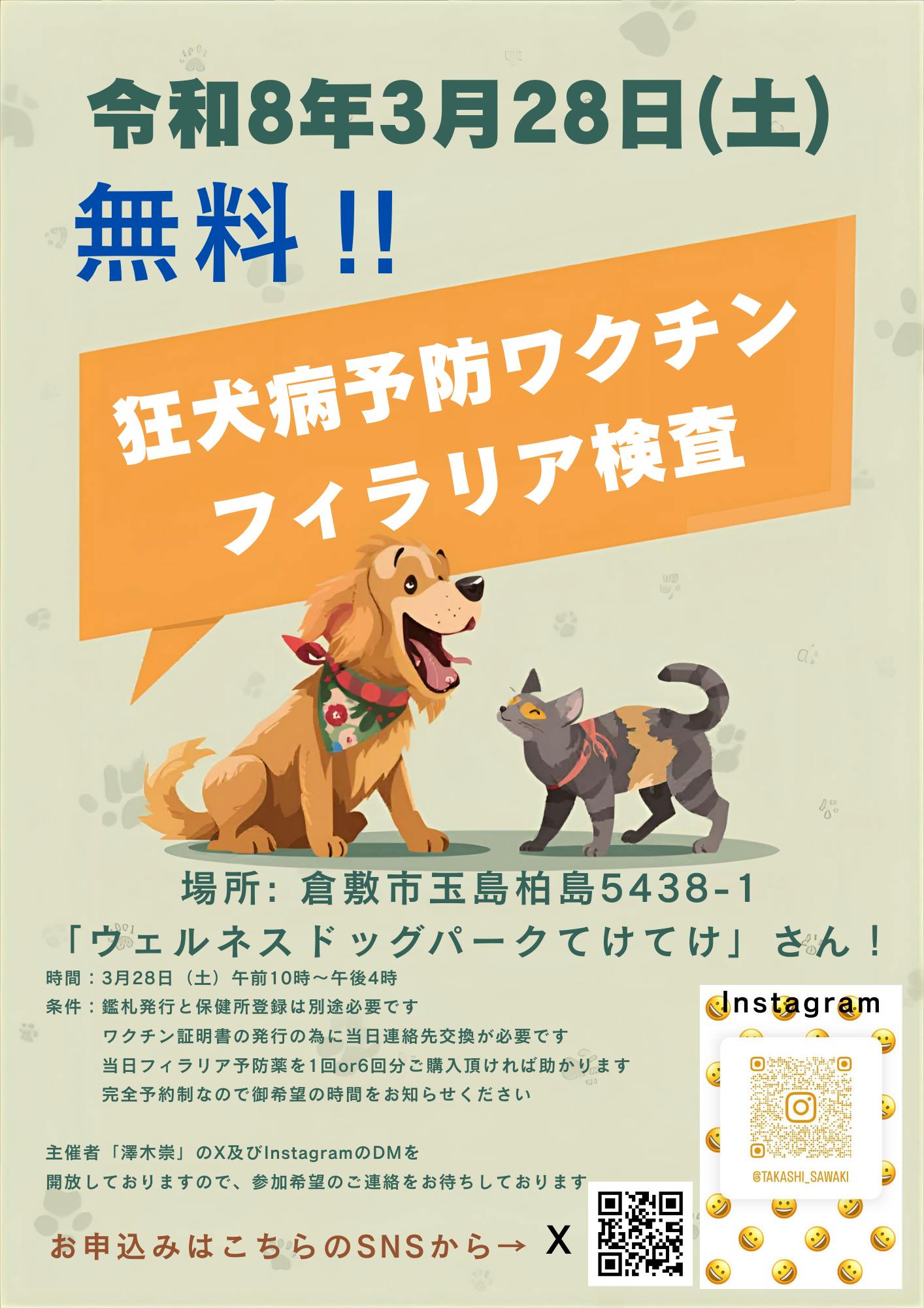 2026年4月 ワクチン接種とフィラリア検査および「フィラリア予防薬(1回分700円~)」か「フィラリア+ノミダニ予防薬(1回分2,500円~)」の販売を実施します。予防薬はそれぞれ1回分か、5回分の価格で6回分のセット販売を予定しています。当日の画像や動画などを可能な限り残します。