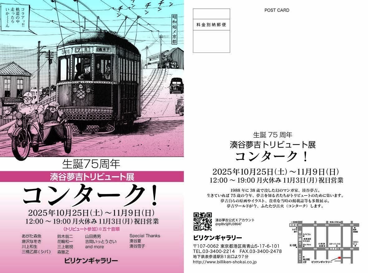 『刑務所の中で』の花輪和一氏をはじめ、夢吉を知る方たちがトリビュート作品を出展しています。また展示会では1985年に発表された『ブリキの蚕』を完全再録したガイドブック『湊谷夢吉生誕75周年 コンターク!』も絶賛販売中です。