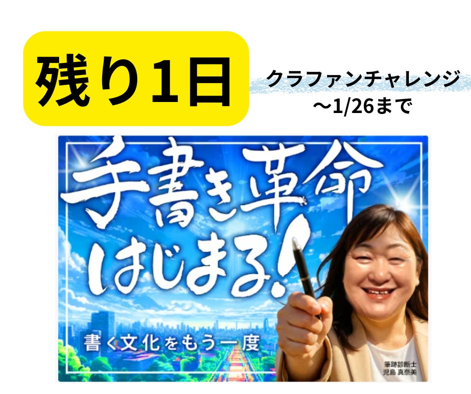 2026/01/25 21:40こんにちは、児島真奈美です。クラウドファンディング終了まで、いよいよあと1日になりました。ここまで来て、今の私の気持ちは、とてもシンプルです。この挑戦は、もう私ひとりのものじゃない。そう思っています。名古屋開催が決まりました。これは、間違いなく応援してくれた皆さんがつくってくれた未来です。支援してくれた人。シェアしてくれた人。黙って見守ってくれた人。それぞれの形で、このプロジェクトに関わってくれたことが、ここまで連れてきてくれました。本当に、ありがとうございます。私はずっと、「書くこと」は特別な人のものじゃない、そう思って活動してきました。字がきれいじゃなくてもいい。うまく書けなくてもいい。でも同時に、書くことが好きな人には、もっと好きでいてほしい。意識の高い人には、この価値を、ちゃんと深く受け取ってほしい。その全部を含めて、“書く時間”を日常に取り戻す体験を、広げていきたいと思っています。このクラウドファンディングは、イベントをやるためだけの挑戦ではありません。書くことで、自分の気持ちに気づく人を増やすこと。忙しさの中で置き去りにしてきた「本当の自分」に戻るきっかけを、あちこちに残していくこと。それが、私が託したい未来です。あと1日。この先、どこまで広がるかは、もう私だけでは決められません。この未来を、あなたに託したい。支援でも、シェアでも、「いいね」でも大丈夫です。あなたが関わってくれた分だけ、次の場所が生まれます。最後の1日。どうか、力を貸してください。 もっと見る