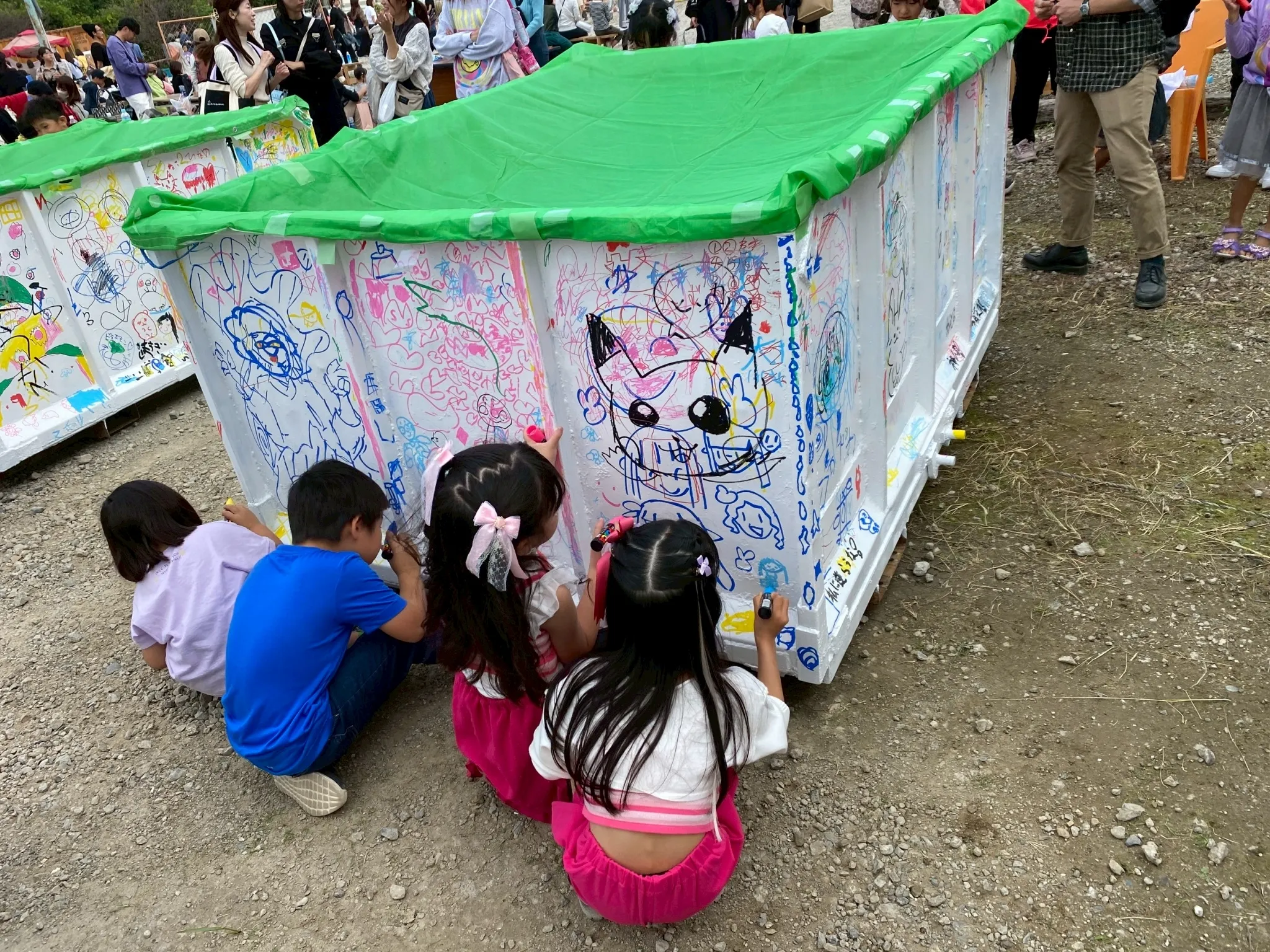 5台のキッチンカーと複数のエアー遊具などを業者様にご協力いただき、抽選くじの豪華景品50個などは自分たちで無料配布して開催しました。キッズダンスステージでは子どもたちがキラキラ輝き、日ごろの成果を存分に魅せてくれましたし、当社が用意したコンテナBOXのペイントコーナーには、多くの子どもたちが夢中になって絵を描いてくれました。地域の皆さんが楽しみ、喜んでくれる姿に私たち自身も感動しましたし、参加してくださった方から「次もぜひ!」という声をたくさんいただきました。