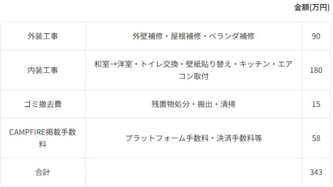 今回のプロジェクトは、自己資金で土地と建物を既に購入しましたので、建築の材料の資金が足りない状況です。