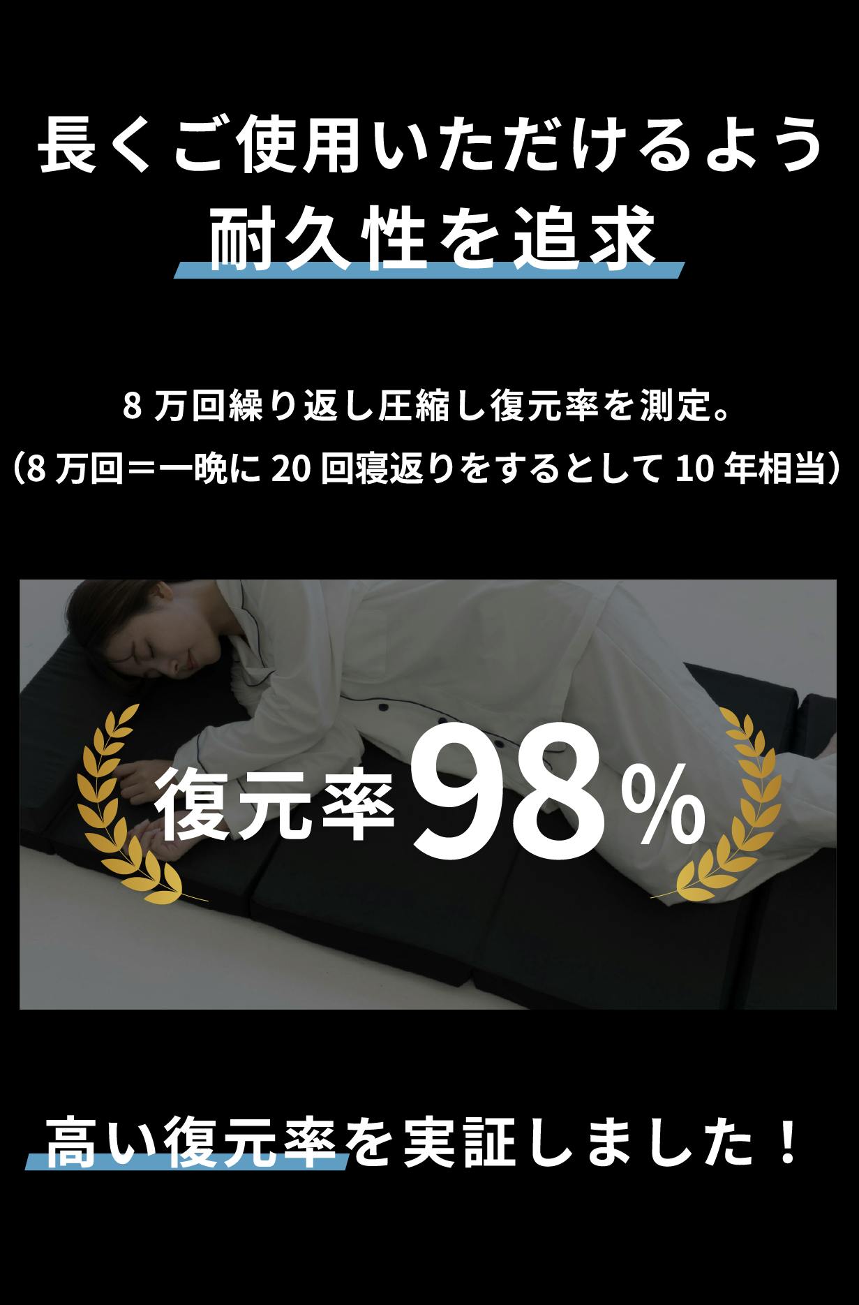 A.一晩に20回寝返りすると仮定して約10年に相当する耐久性試験をクリア(復元率98%)した素材を採用しています。