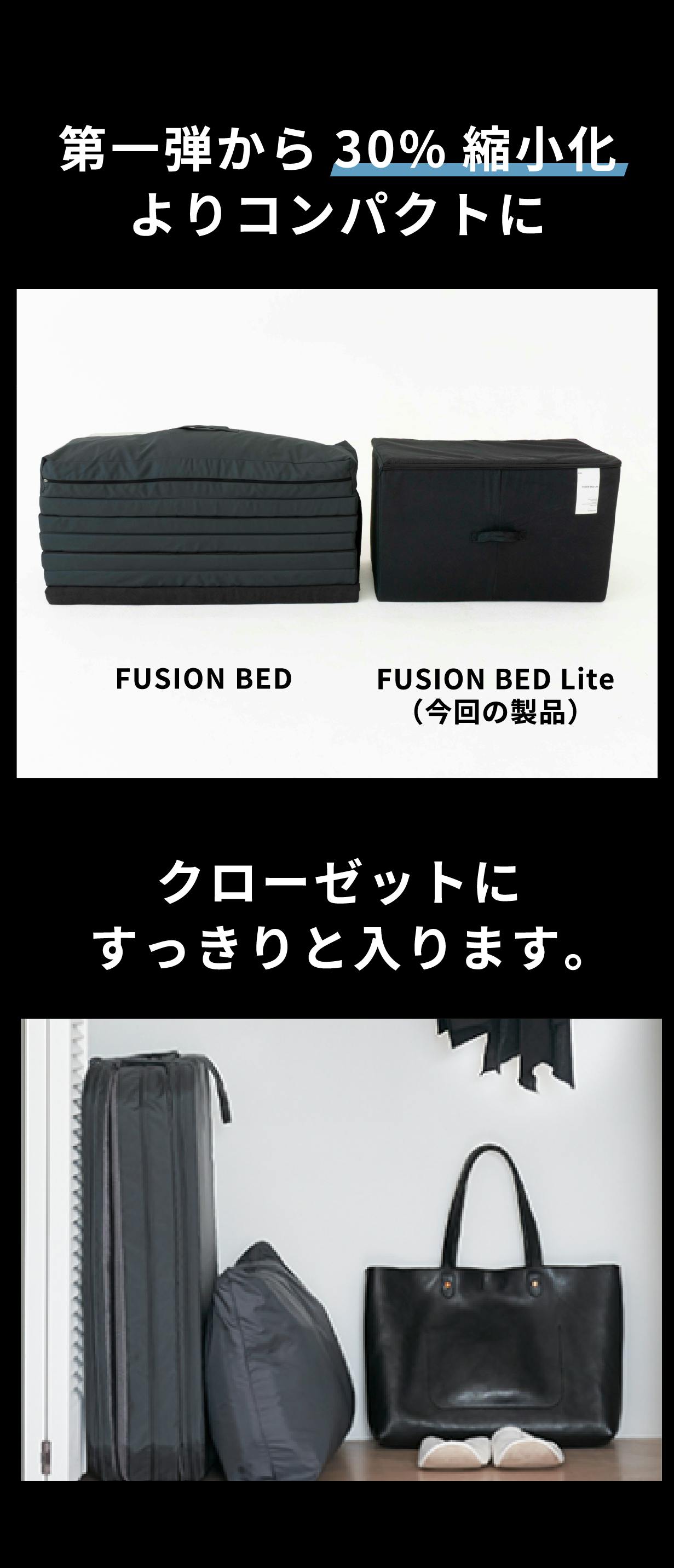 2025/11/12 12:14みなさんこんにちは!商品開発担当です。本日は、FUSION BED Lite開発のきっかけをお話ししたいと思います。「寝具って、もっとシンプルでいいのでは?」FUSION BED Lite の開発のきっかけは、創業メンバーの東京でのワンルーム暮らしでした。「布団が部屋の大部分を占領してしまう」「収納するにもスペースが足りない」そんな日常の悩みを解決したいと考えたのです。マットレス・掛け布団・枕を“ひとつ”に。そこでたどり着いたのが、“全部入り”のコンパクトベッド。マットレス・掛け布団・枕を一体化させ、使わない時はバッグのように小さくまとめられる仕組みを考案しました。来客用にも、防災用にも、もちろん普段使いにも対応できる「新しい布団の形」です。前作からの学びを活かして。前作「FUSION BED」は1万件以上の応援購入をいただきました。実際に使ってくださった方々からの声を受け、さらに“コンパクト・扱いやすく・持ち運びやすい”モデルとして誕生したのが FUSION BED Lite です。「布団は重くてかさばる」という常識を手放し、「必要な時に、必要な場所で、すぐに使える布団」を当たり前にしたい。FUSION BED Lite は、そんな思いから生まれたプロダクトです。最後までお読みいただきありがとうございます! もっと見る