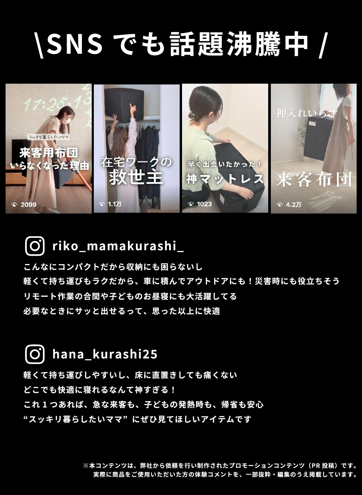 使わない時はコンパクトに収まり、省スペース。来客用布団としてすぐに用意できるので、突然のお泊まりでも「あってよかった」をご提供いたします!