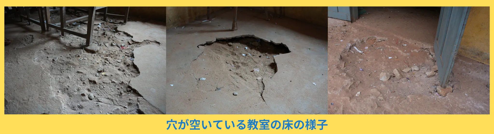 子どもたちが使う教室のコンクリート床が破損し穴が開いており、デコボコで机を置ける場所が限られてしまっています。