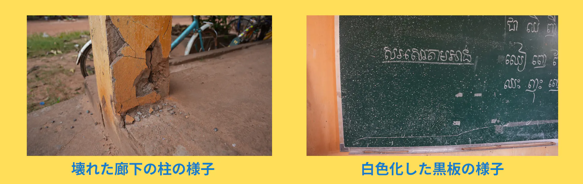 破損している教室のコンクリート床の修繕、破損し鉄筋がむき出しの通路の修復、文字が読みにくい黒板の買い替えを行います。