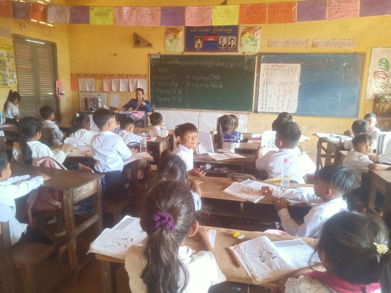 黒板の上部には先の王様、シアヌーク殿下と皇后様、お二人のお子さんである現在のシハモニ王様の写真が飾られています。公立学校の教室には基本的にこのお写真があり、何かのセレモニーの時は国歌斉唱が冒頭にあるのが一般的です。