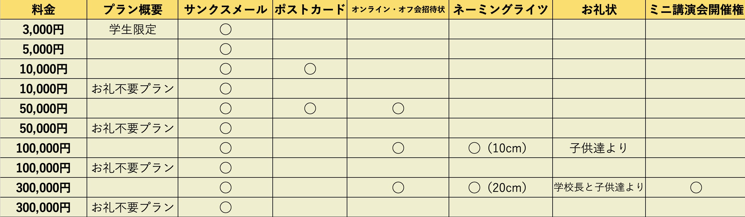 300,000円: 学校長と小学生からの礼状、責任者・宮本の「ミニ講演会開催権」(希望時)、小学校の壁へのネーミングライツ(20㎝程度、希望者)、サンクスメール