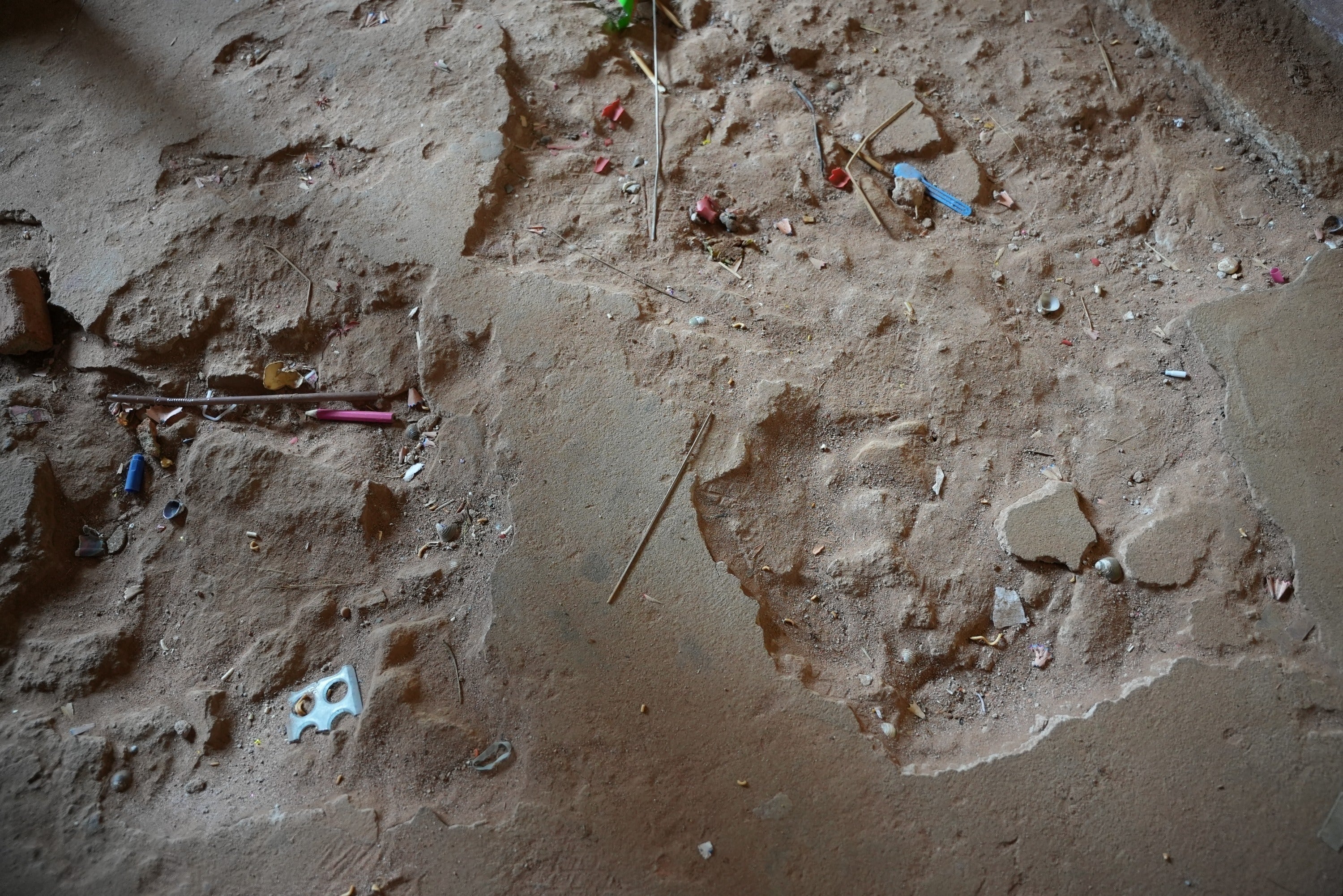 子どもたちが使う教室のコンクリート床が破損し穴が開いており、デコボコで机を置ける場所が限られてしまっています。