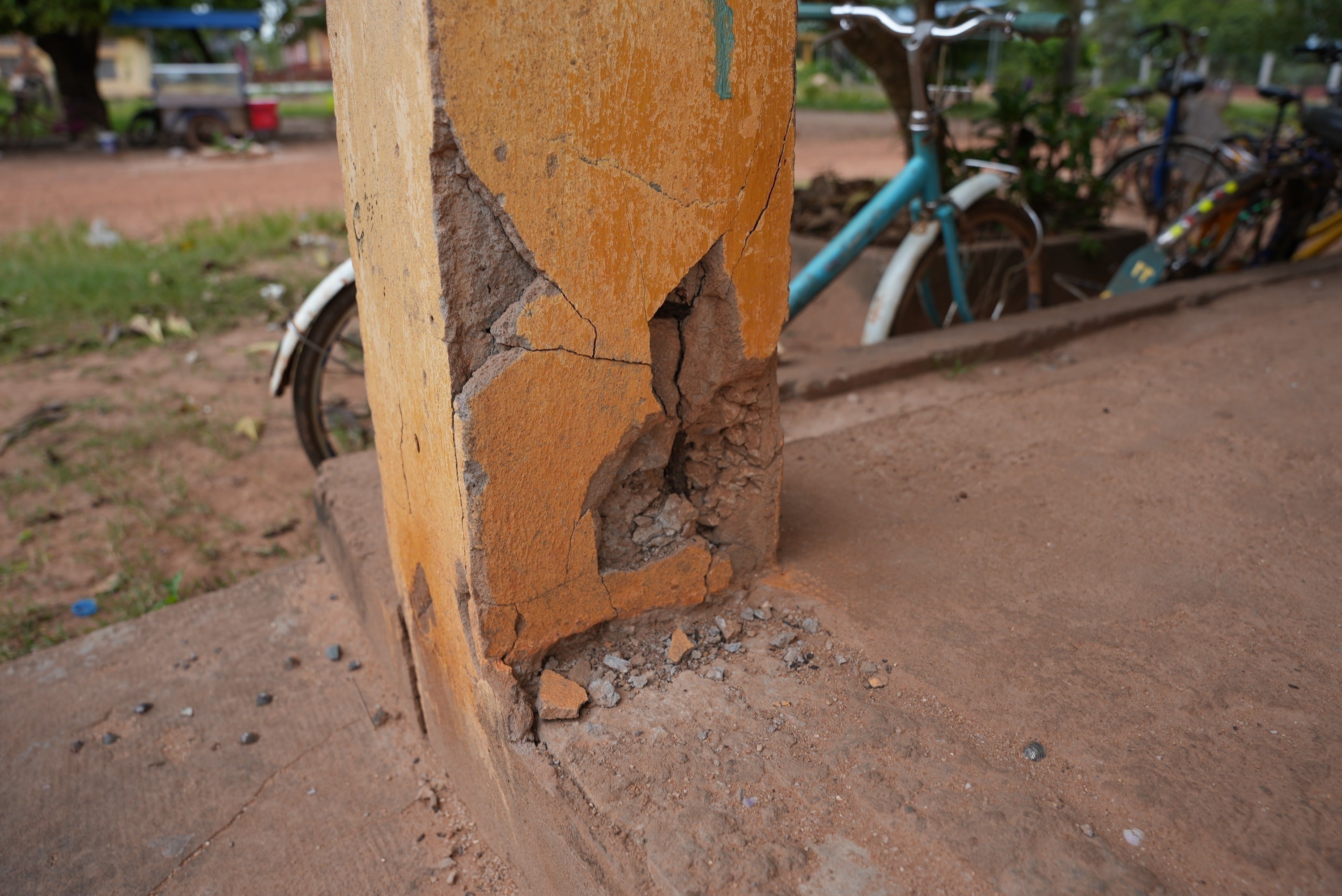 バニュー小学校はカンボジア内戦が落ち着いた1980年代後半に建設が始まり、一部校舎は建設から40年が経とうとしています。2025年3月訪問時に、この状況を宮本が確認、学校には修繕をする予算が無く、貧しい家庭の子どもたちが多いため、保護者からの寄附を集めることも困難で、修繕の目途が立たないと、学校長から相談と協力依頼があったことがきっかけです。