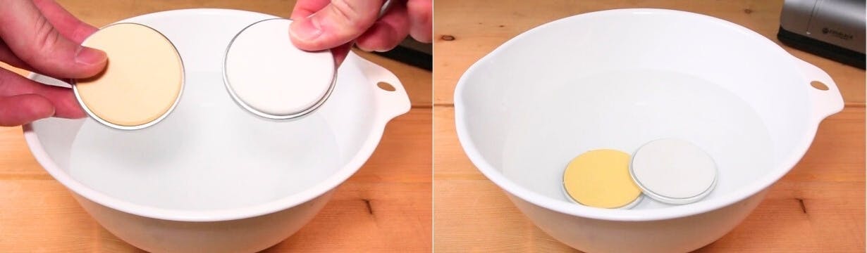 A:ダイヤモンド砥石は水に漬ける必要はありません。一方コランダム砥石は使用前に5分程度水に漬ける必要がありますので、包丁砥ぎの準備をするとき初めに水に漬けておくとスムーズに砥ぎ作業を行うことが出来ます。
