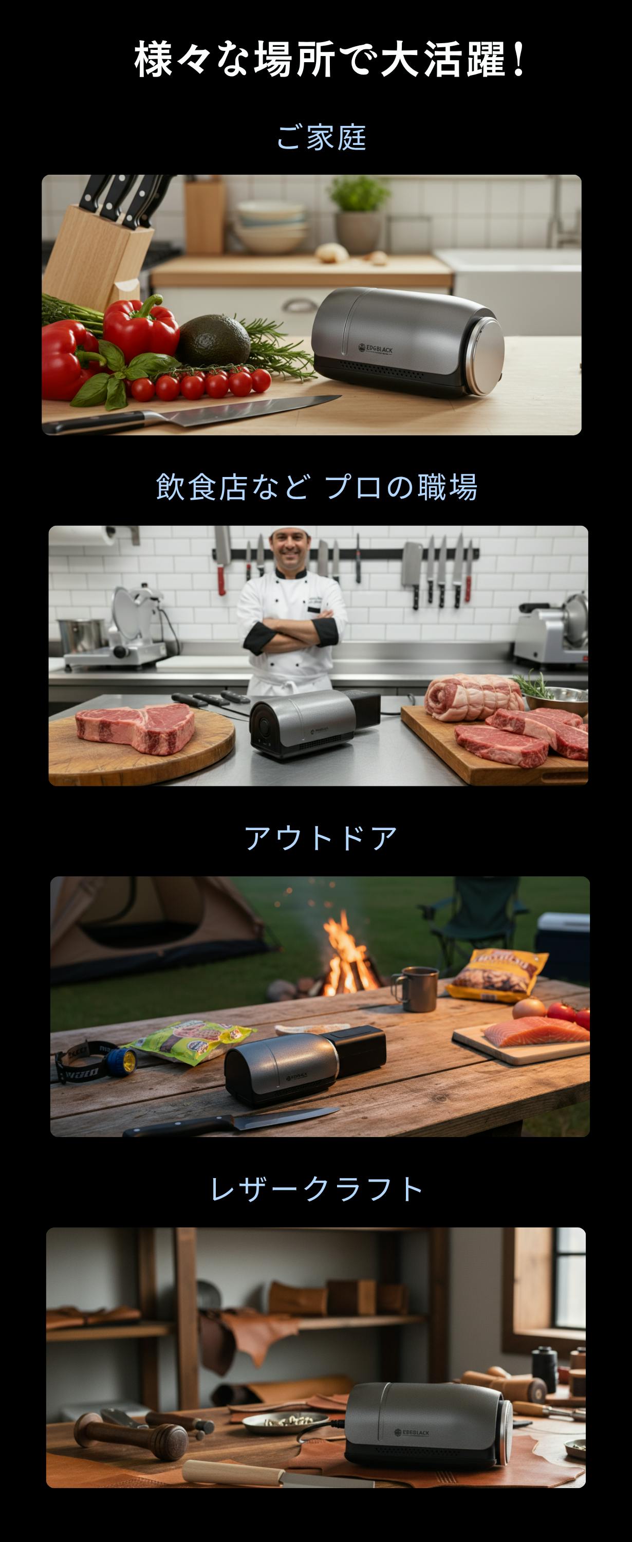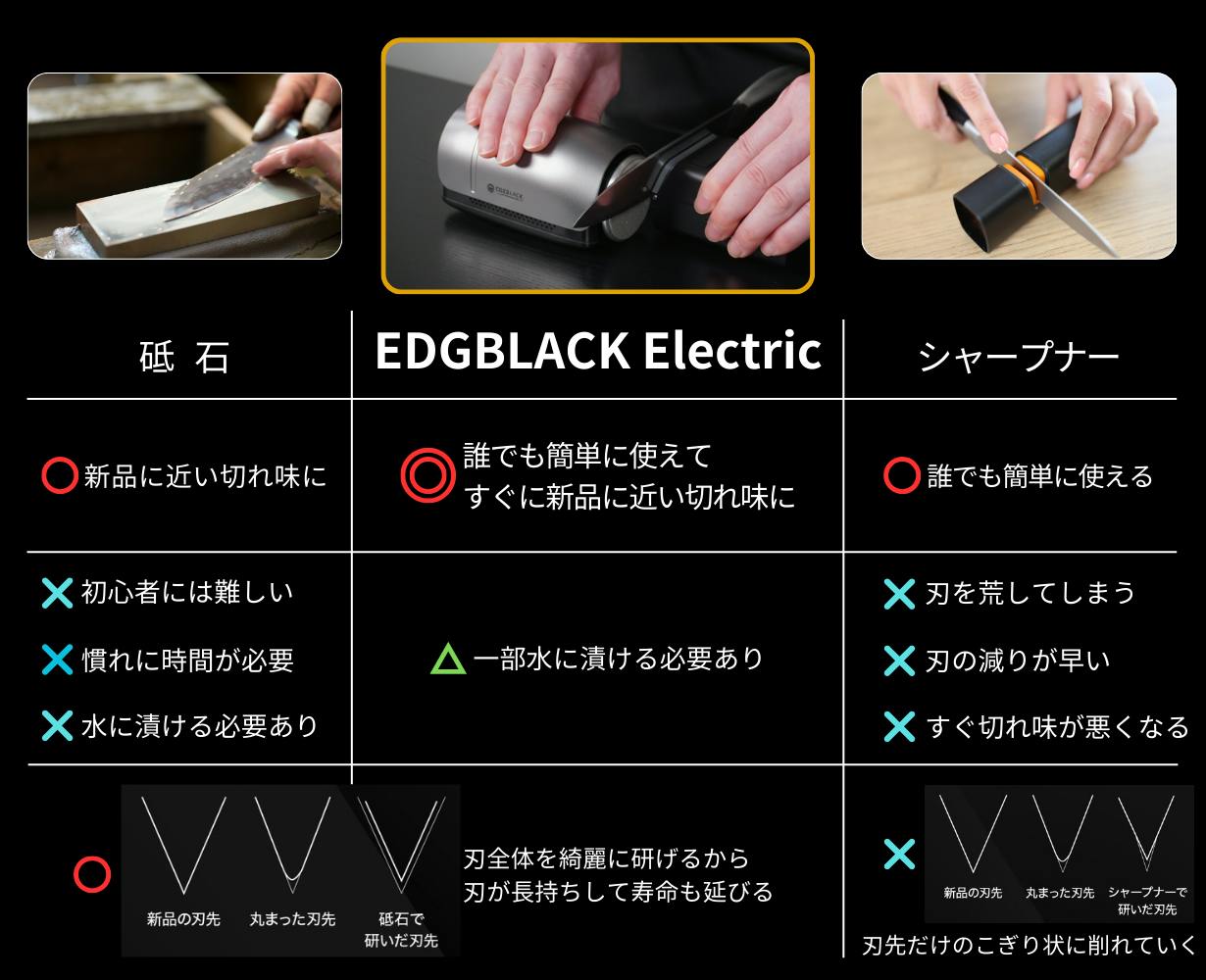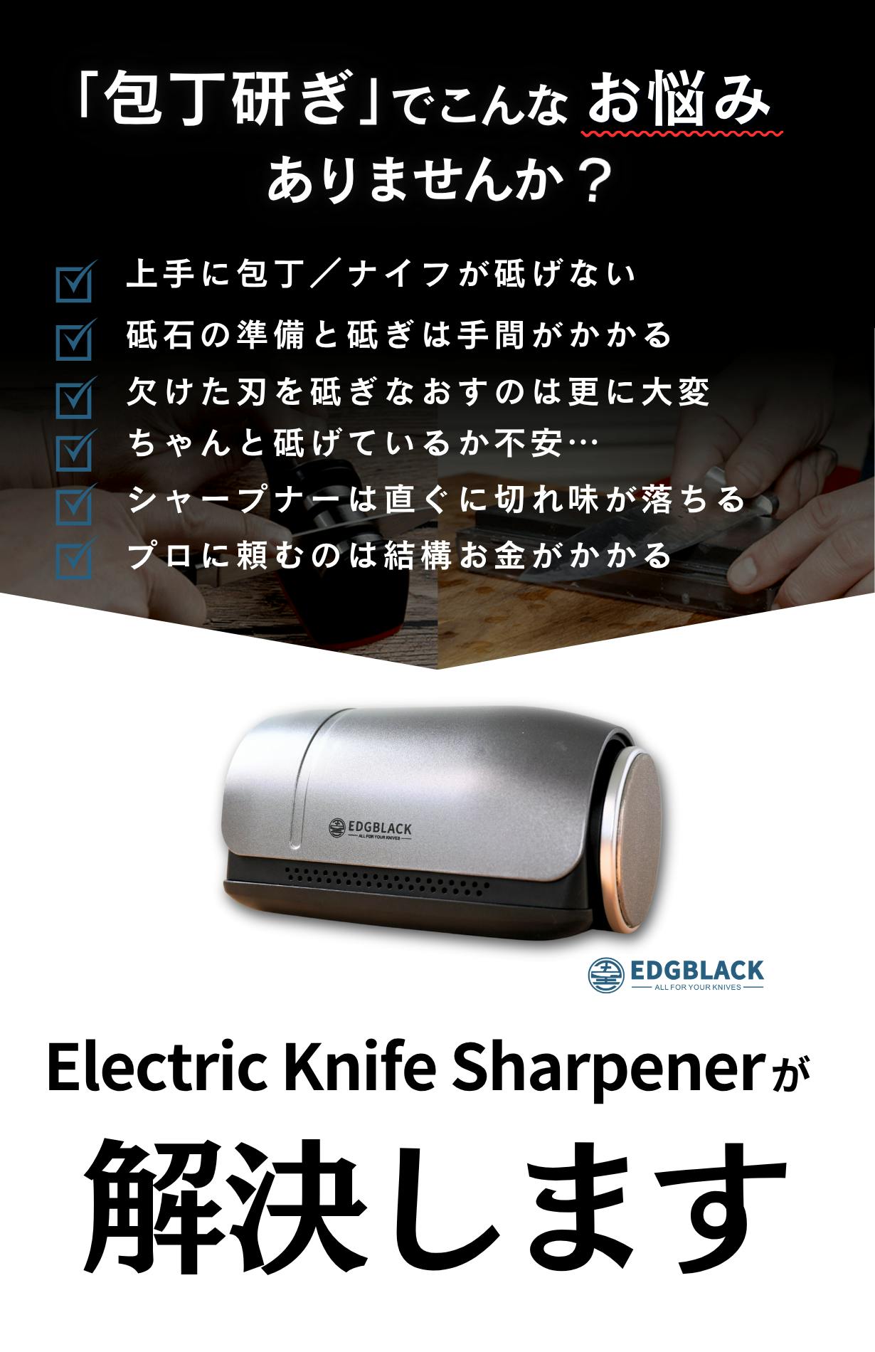 この度、砥石を電動で回転させることで、ご家庭・プロの調理場・アウトドアでも非常に簡単にプロフェッショナルな切れ味を実現できる新製品「EDGBLACK Electric Knife Sharpener(エッジブラック エレクトリックナイフシャープナー)」を開発いたしました。