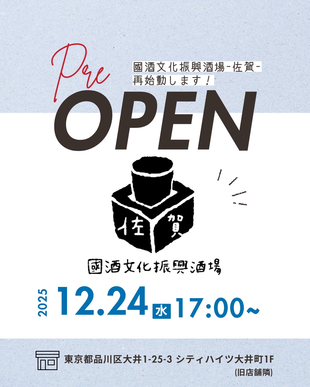 2025/12/23 10:56皆さま大変長らくお待たせいたしました。國酒文化振興酒場-佐賀-再始動の日が決まりました!!!【12月24日(水)17:00 】新店舗プレオープンします!年内営業日は24日(水)、25日(木)、26日(金)の3日間となります。土日はイベント出店となりますため日数が少なく恐縮ですが、新店舗お披露目&年内最後のご挨拶ができれば嬉しいです!お時間がゆるしましたらぜひ遊びにいらしてください。皆さまのご来店をお待ちしております!國酒文化振興酒場-佐賀- もっと見る「サポーターカード」が完成しました!