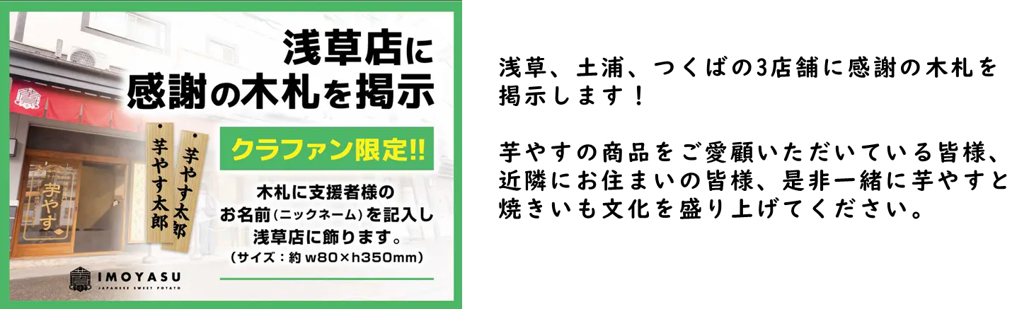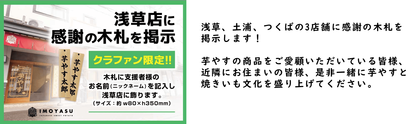 皆様からご支援いただいた資金は、リターンの仕入れ費用やクラウドファンディングの手数料の他、芋やすと茨城県の焼き芋文化を広めるためのイベント出店や店舗運営費用などに使わせていただきます!