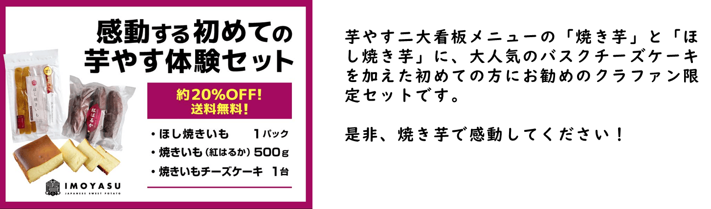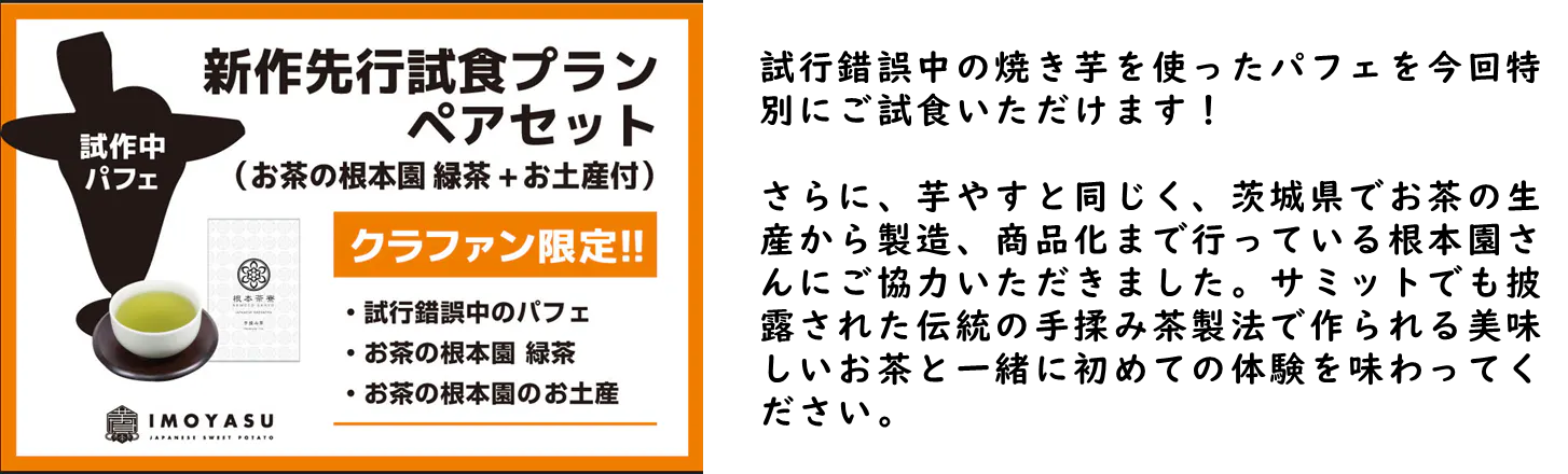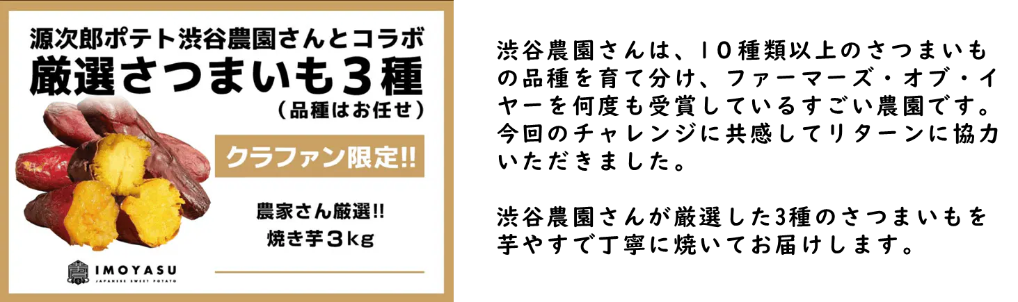 今回の挑戦をきっかけに、初めて芋やすを知った方に向けたお試しセットや、すでに芋やすの商品を愛用頂いている方にも喜んでいただけるようなリターンを複数用意しました!