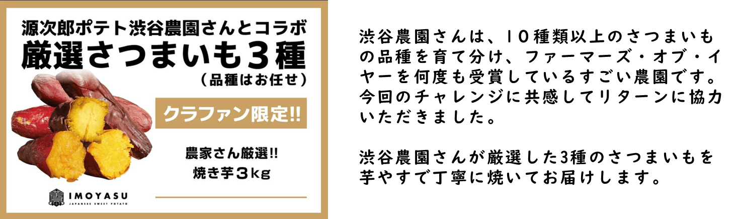 他にも、今回の挑戦に合わせ、オンライン販売リクエストNo1の芋けんぴや、芋やすオリジナル商品などのリターンもたくさんご用意しております!