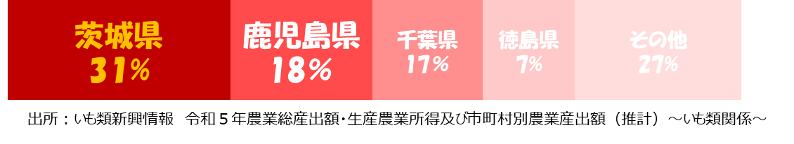 茨城県は干し芋の生産量・出荷額ともに全国1位で、国内シェアの約9割を占めているとも言われています。干し芋は生芋よりも高く販売されますし、私たち芋やすのような焼き芋専門店や菓子屋などが多くの加工品を作り、農業の六次産業化を実施しながら付加価値を高めているので、さつまいもの産出額日本一になっています!