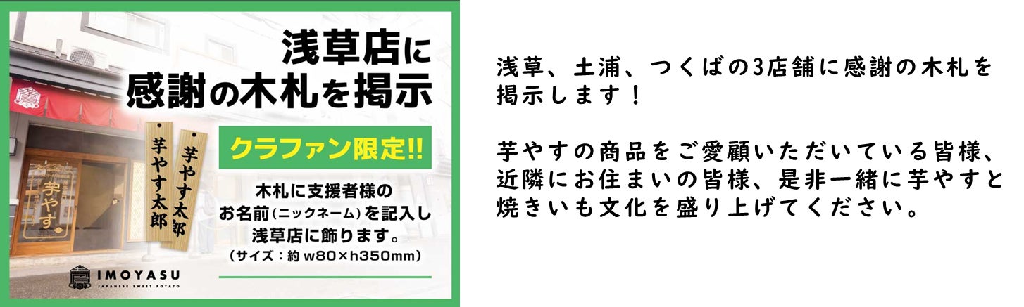 皆様からご支援いただいた資金は、リターンの仕入れ費用やクラウドファンディングの手数料の他、芋やすと茨城県の焼き芋文化を広めるためのイベント出店や店舗運営費用などに使わせていただきます!