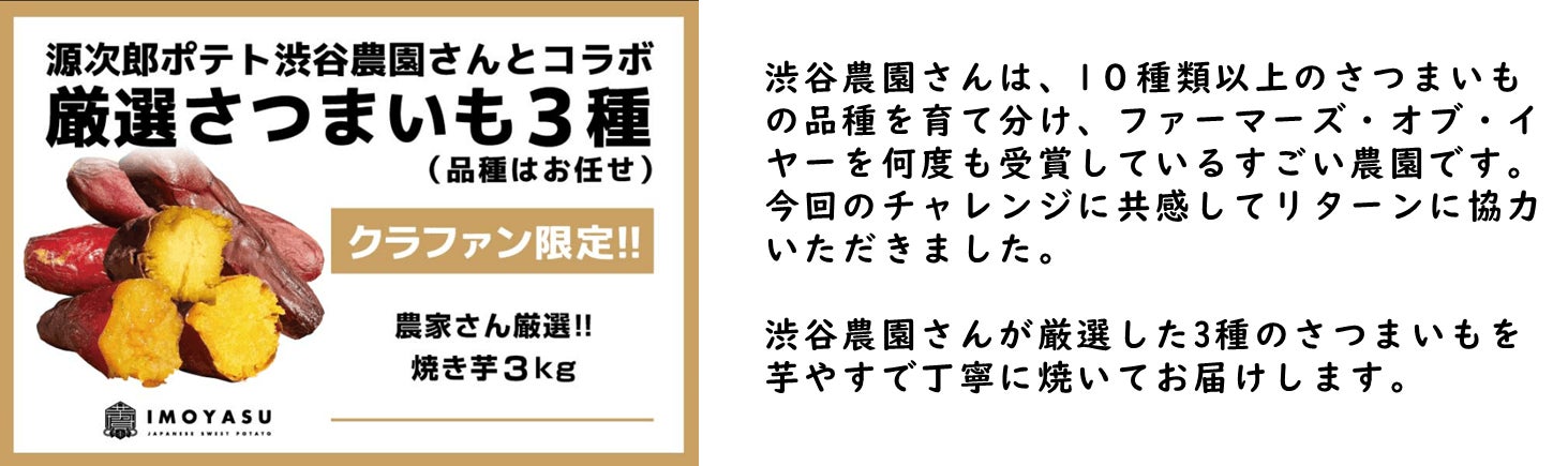 他にも、今回の挑戦に合わせ、オンライン販売リクエストNo1の芋けんぴや、芋やすオリジナル商品などのリターンもたくさんご用意しております!