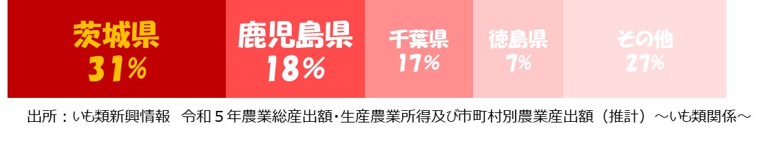 茨城県は干し芋の生産量・出荷額ともに全国1位で、国内シェアの約9割を占めているとも言われています。干し芋は生芋よりも高く販売されますし、私たち芋やすのような焼き芋専門店や菓子屋などが多くの加工品を作り、農業の六次産業化を実施しながら付加価値を高めているので、さつまいもの産出額日本一になっています!