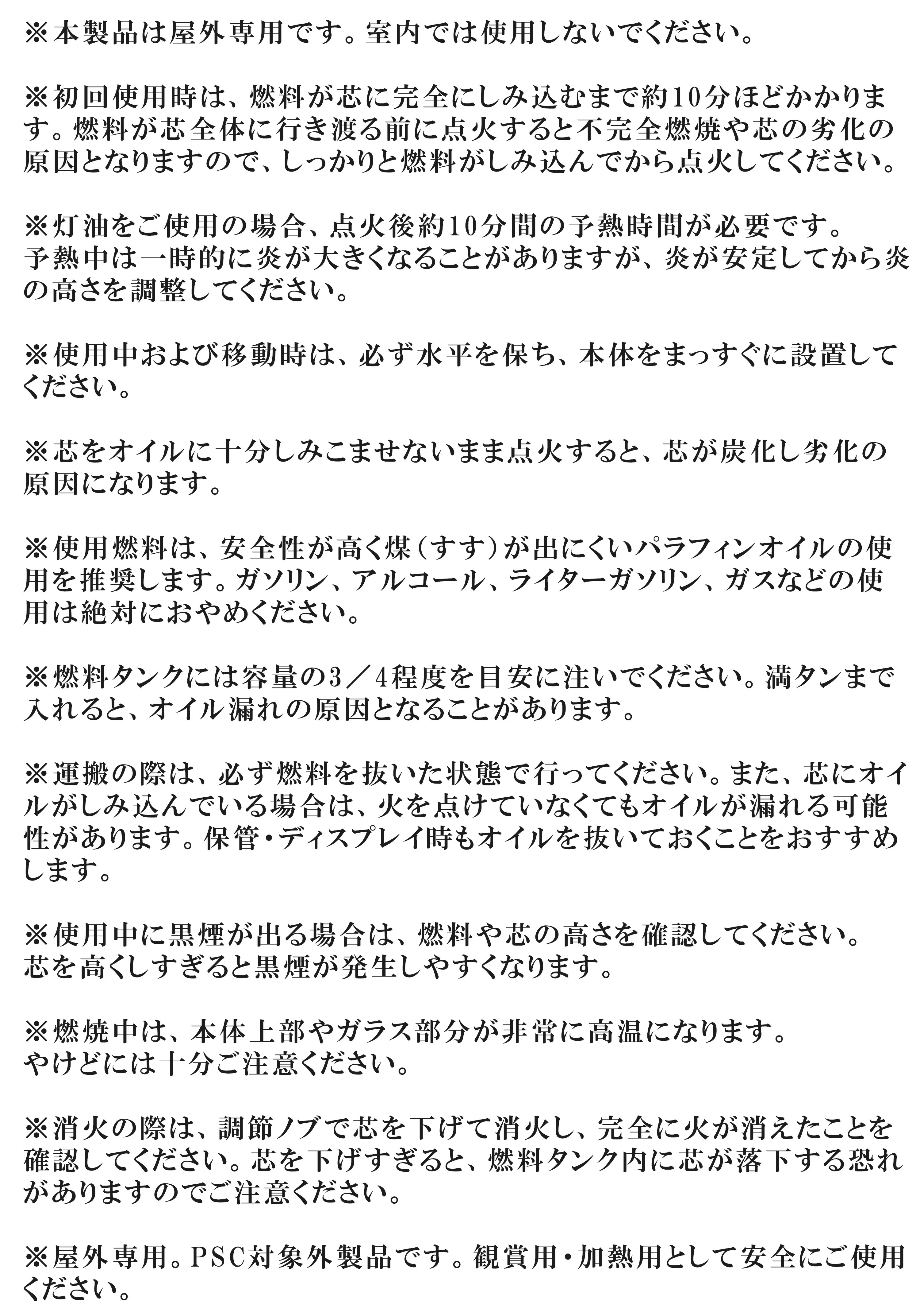 燃焼時間:約9時間(パラフィンオイル仕様満タン時)