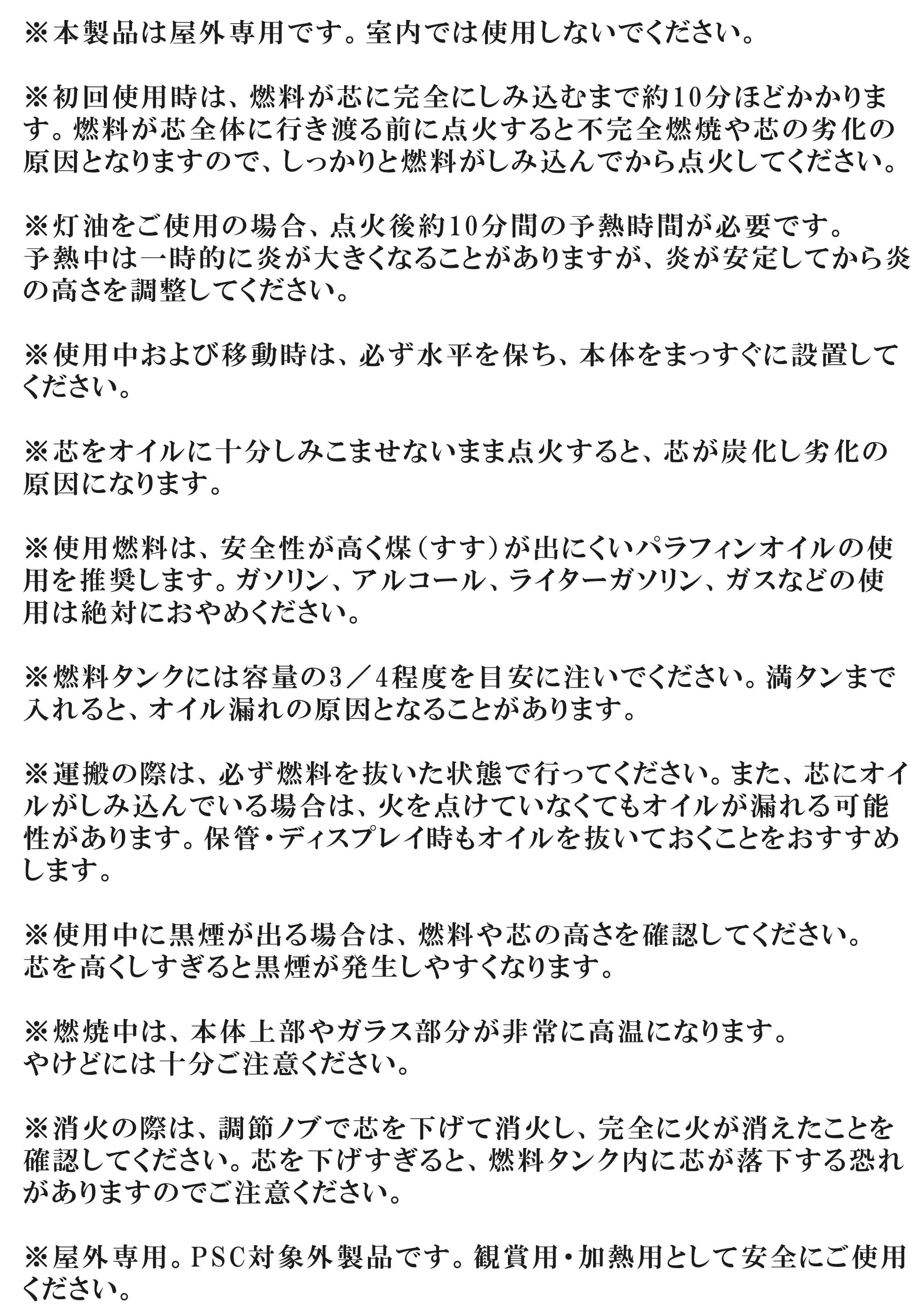燃焼時間:約9時間(パラフィンオイル仕様満タン時)