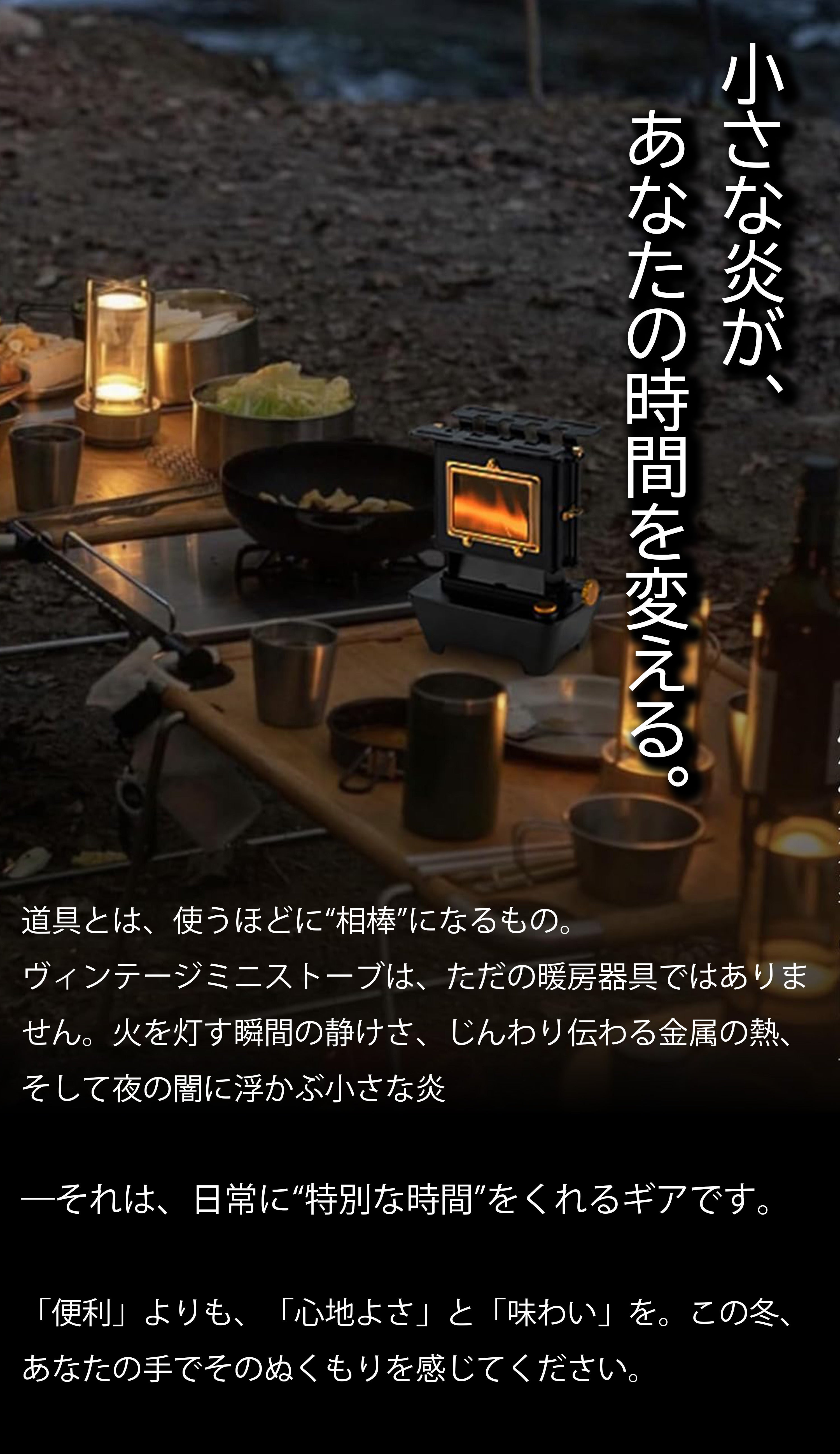 キャンプサイトで、机の上で、どこに置いても雰囲気を変えてくれる。手のひらサイズの「Vintage Stove」は、自然の中で過ごす時間をさらに特別なものにしてくれる道具。燃える炎と鉄のぬくもりが、心までじんわりとあたためる。
