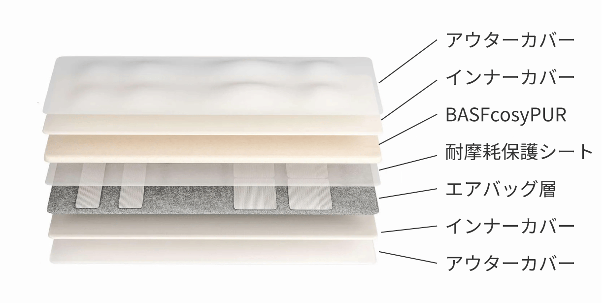BASFcosyPURは粘弾性と通気性を兼ね備えたウレタンフォームで圧力を均一に吸収する作用があり、体を預けるとゆっくりと体が沈み込み、まるで雲の上で寝そべっているかのような心地よさ。