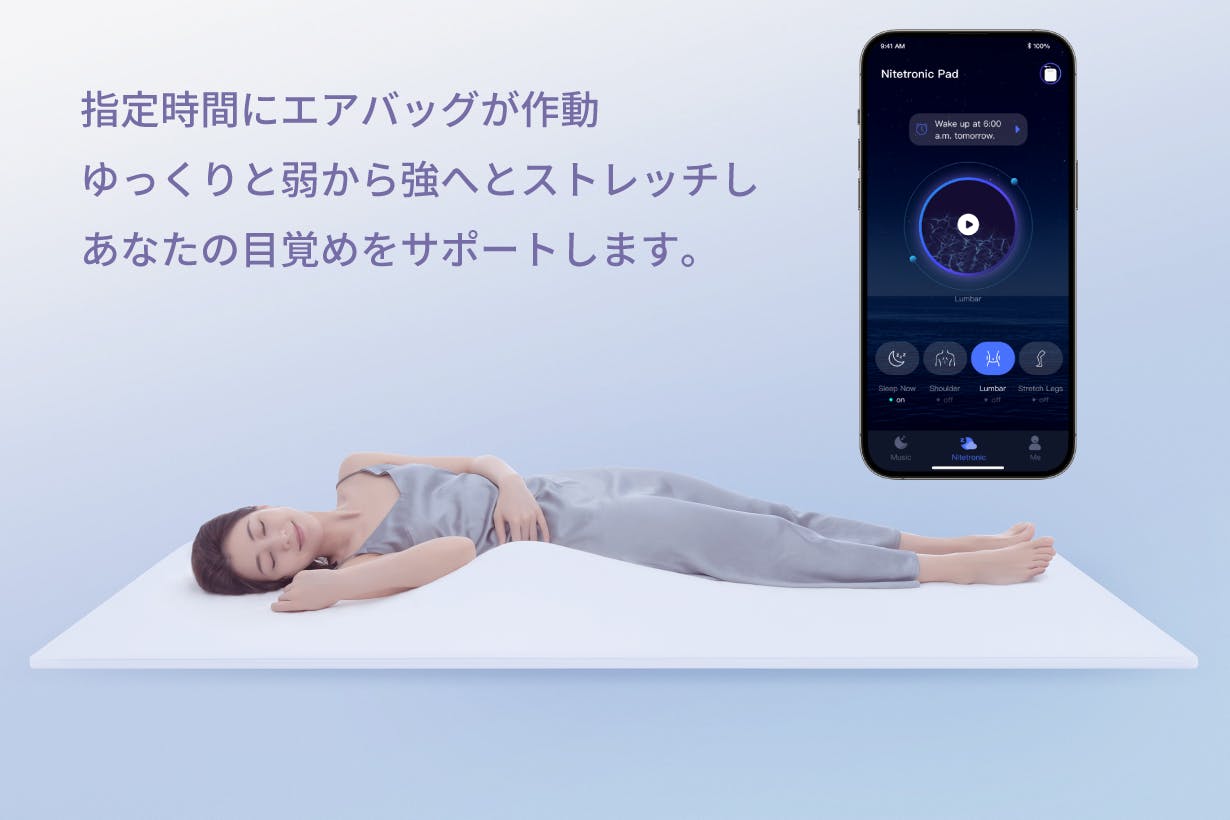 Nitetronic T3 Proのスマホアプリにはタイマー機能があり、Wi-Fi環境下でNitetronic T3 Proに接続してタイマー設定すると、指定時間にエアポンプがあなたの体をゆっくり揺らして、朝の目覚めを優しくサポートします。