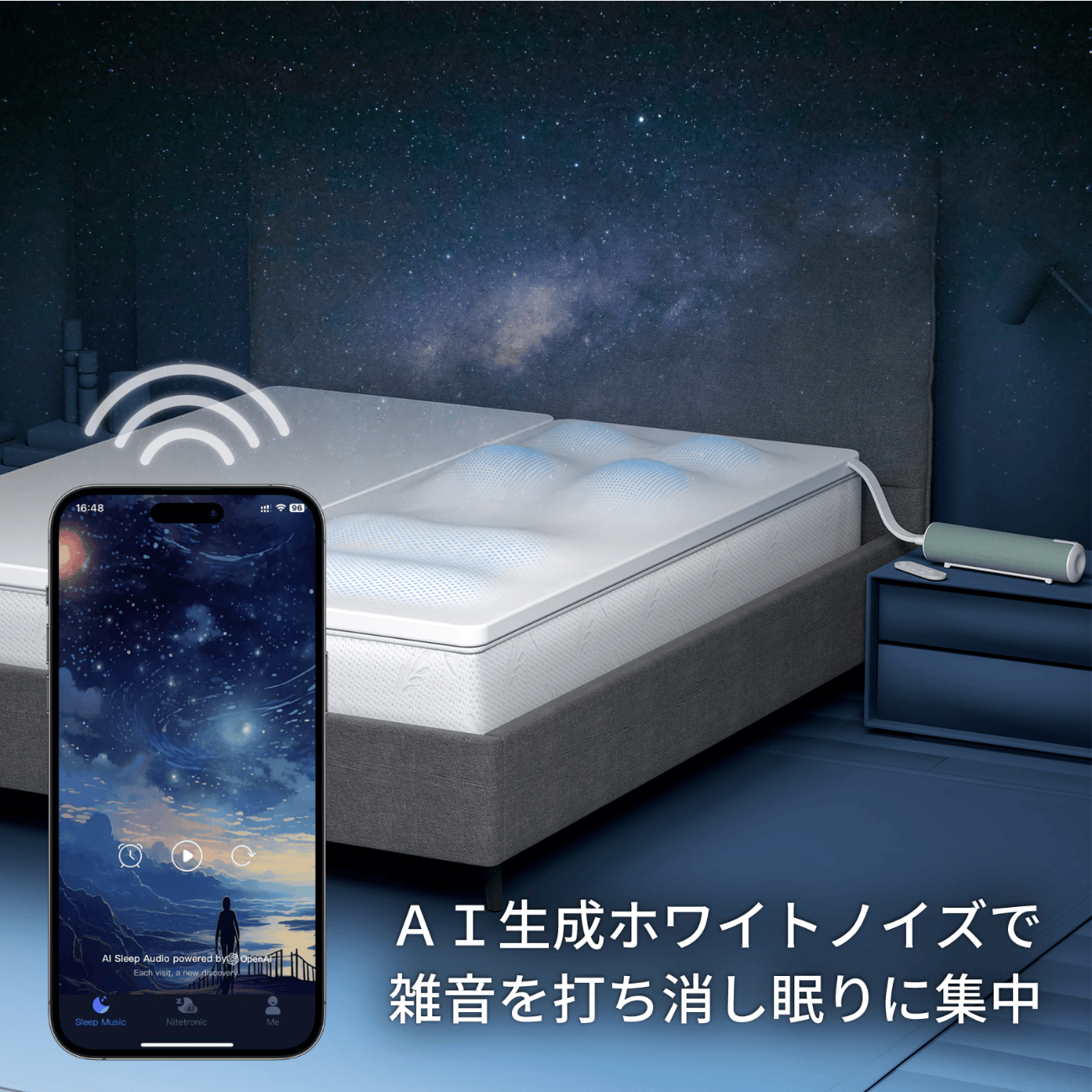Nitetronic T3 Proのホワイトノイズは心地よい眠りを実現するため生成AIで作成した特別製です。数種類のサウンドを用意しているので、その日の気分に合わせてご利用ください。