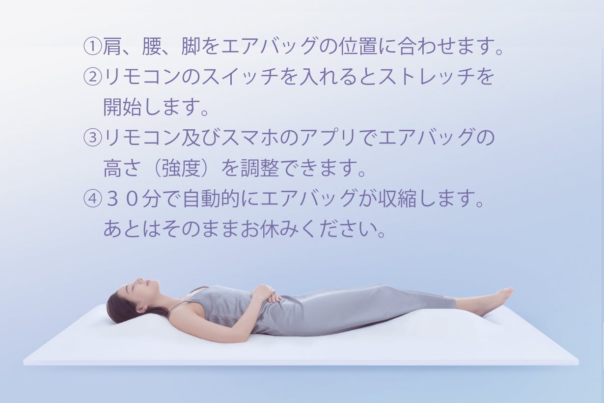 寝ころんだまま肩、腰、脚に設けた6つエアバッグが体全体を効率的にストレッチ。