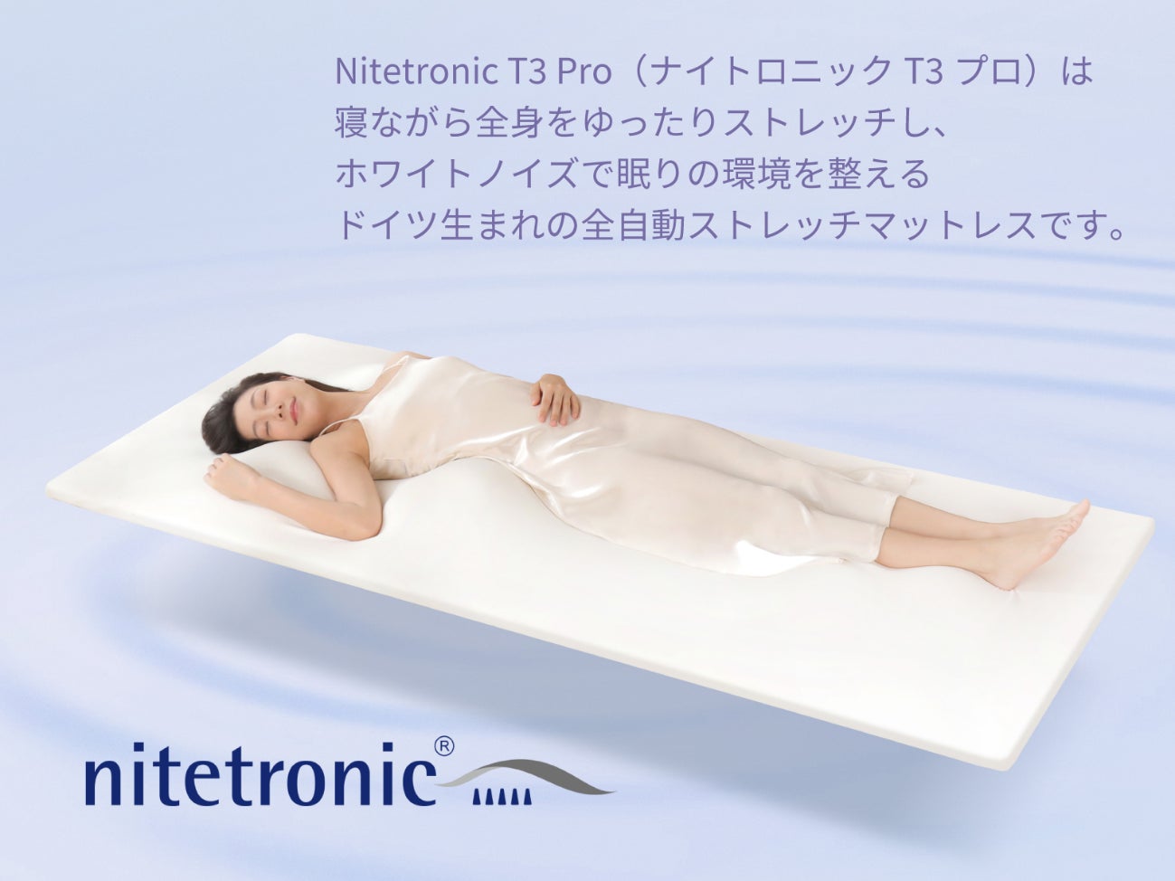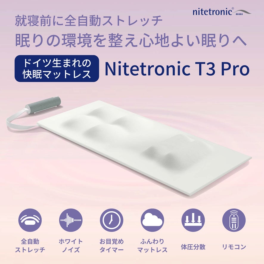 Nitetronic T3 Pro(ナイトロニックT3プロ)は就寝前のストレッチ効果に着目し、睡眠に関し多くの研究開発を行い科学的な見知から寝具を制作しているドイツのメーカー、ナイトロニック社が開発した全自動ストレッチマットレスです。