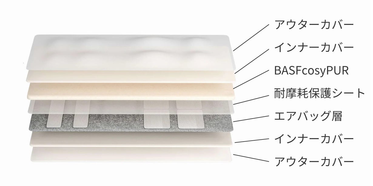 BASFcosyPURは粘弾性と通気性を兼ね備えたウレタンフォームで圧力を均一に吸収する作用があり、体を預けるとゆっくりと体が沈み込み、まるで雲の上で寝そべっているかのような心地よさ。