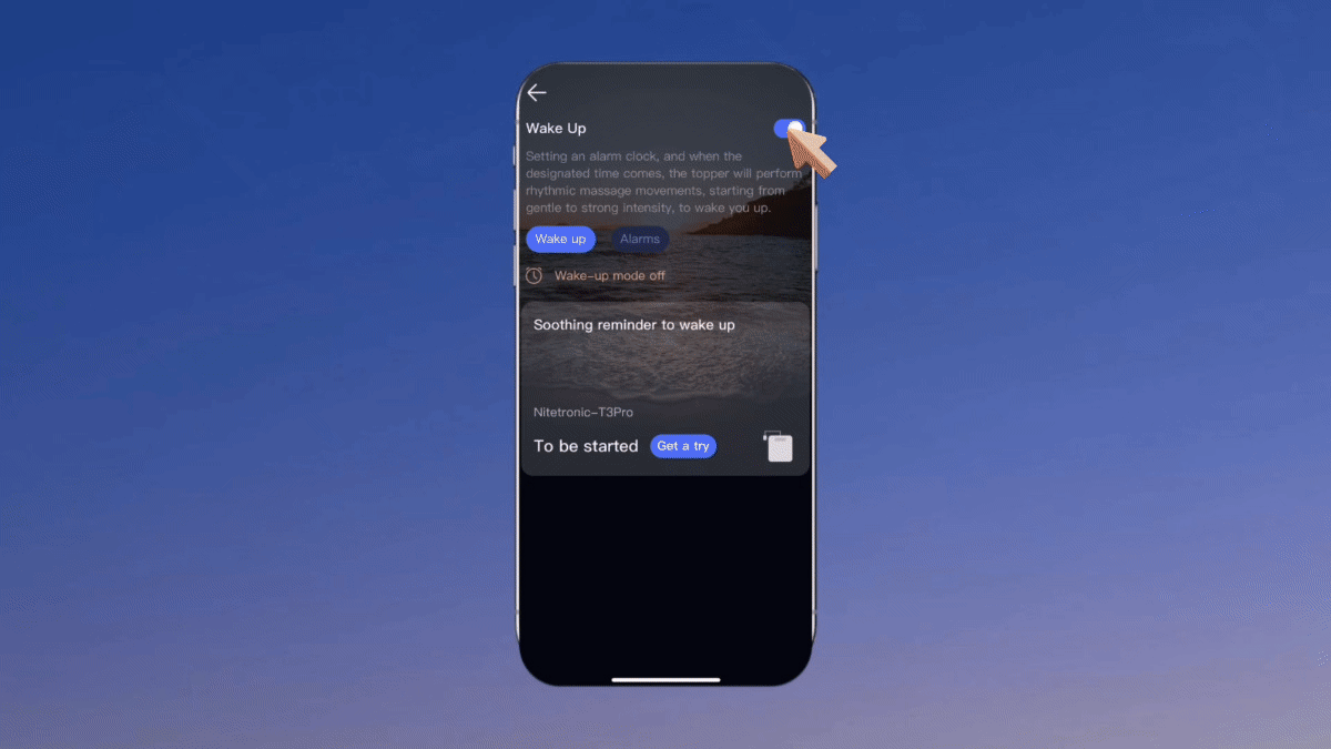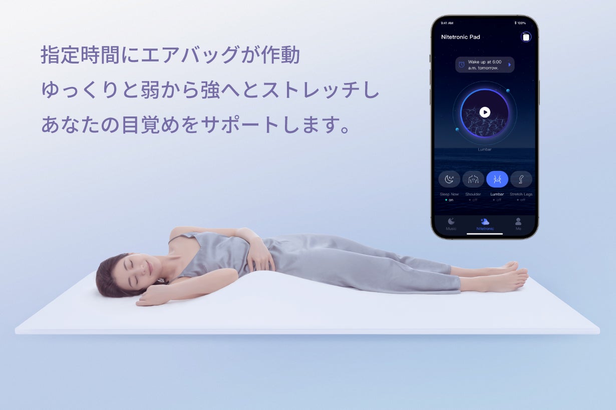 Nitetronic T3 Proのスマホアプリにはタイマー機能があり、Wi-Fi環境下でNitetronic T3 Proに接続してタイマー設定すると、指定時間にエアポンプがあなたの体をゆっくり揺らして、朝の目覚めを優しくサポートします。