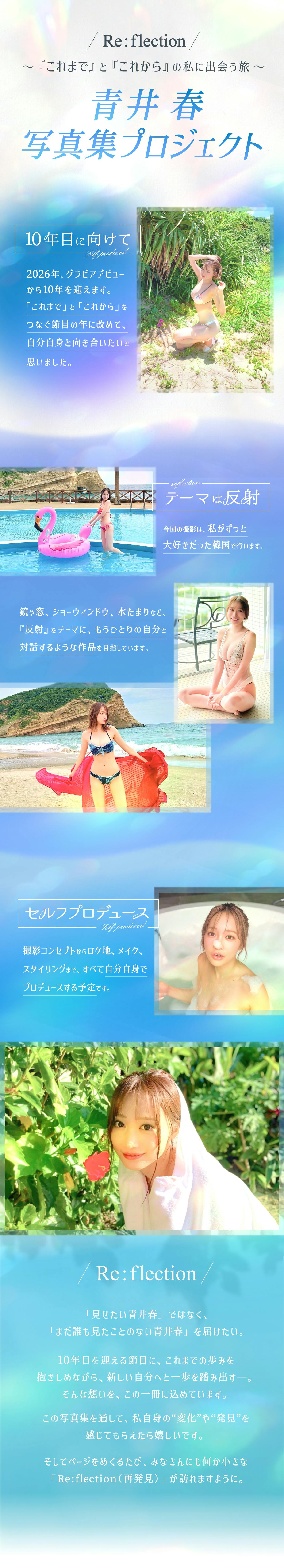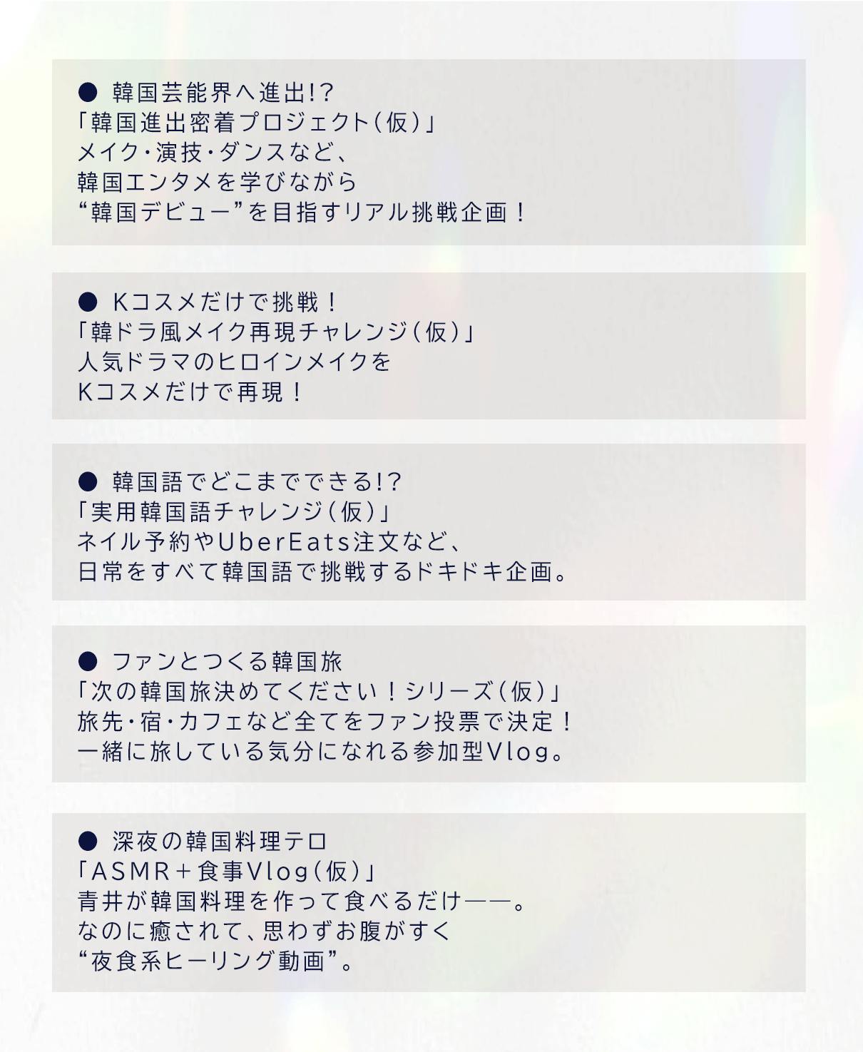 韓国・ソウル近郊で行う撮影会に参加できる特別企画。青井春とのリアルな撮影体験を楽しめます。※交通費・宿泊費は各自負担〈開催時期:2026年2月下旬〜3月上旬〉〈含まれるコース:韓国撮影会コース/韓国オフ会コース〉