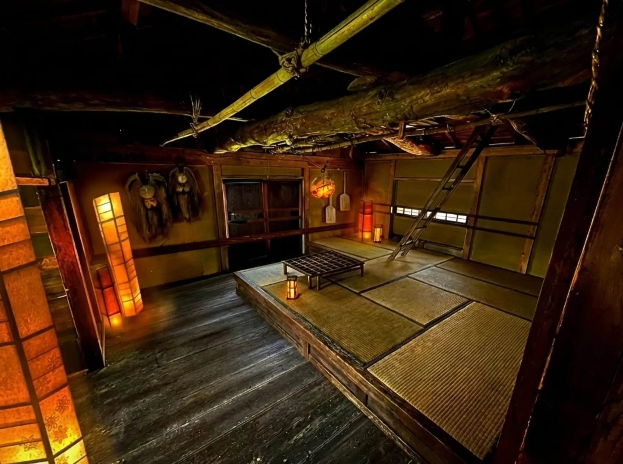 三郎爺さんは黙ったまま階段を指す。二階の一室――蚕部屋の引き戸を開けると、空気が変わった。母屋の廊下から一段下がった床、高い天井を渡る丸太梁は、古樹の芯が空へせり出したようにたしかで、暗がりの奥にたゆたう。