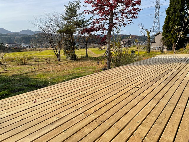 デッキの向こうで、子どもが自転車のペダルを空回しさせて笑っていた。