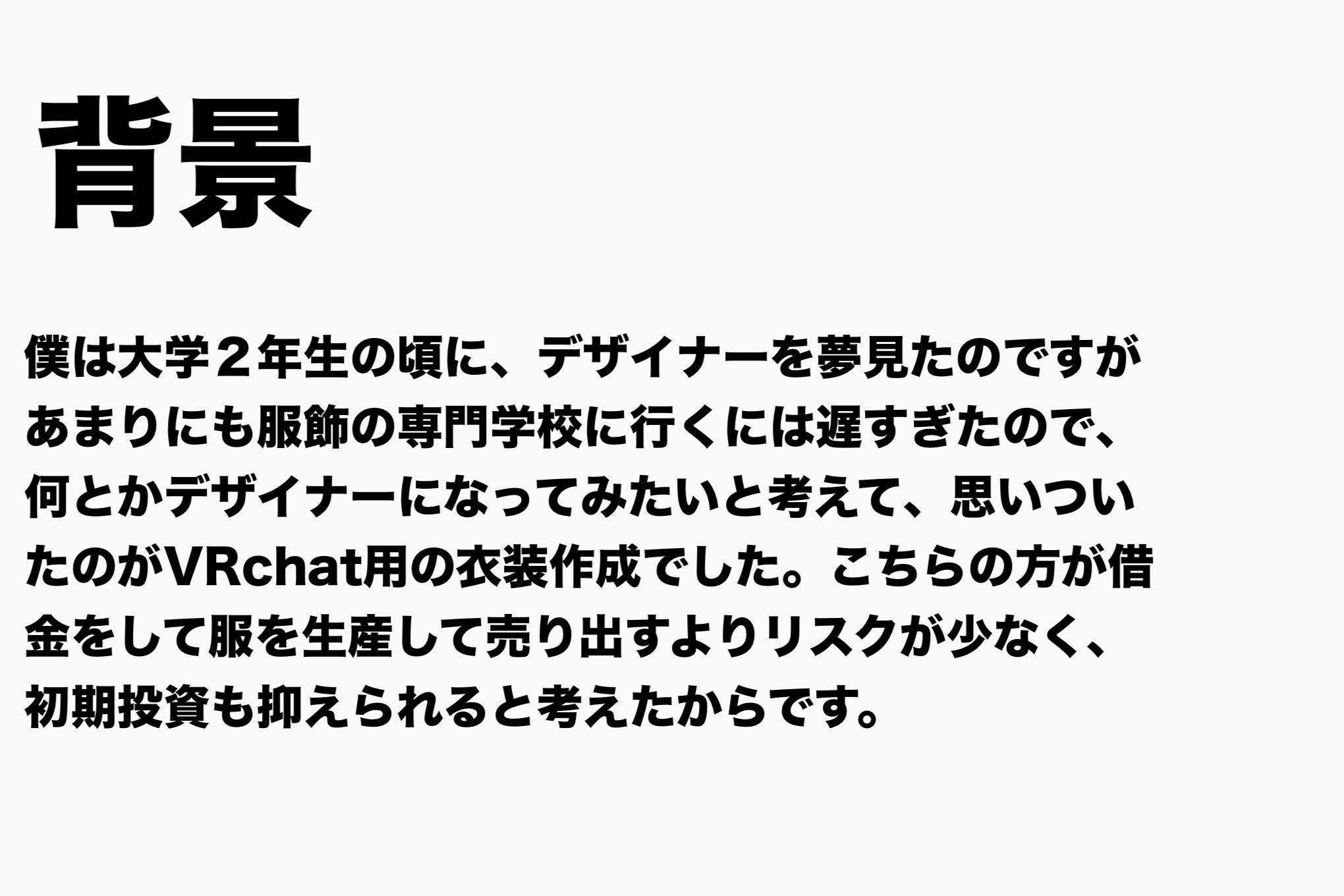 僕は大学2年生の頃に、デザイナーを夢見たのですがあまりにも服飾の専門学校に行くには遅すぎたので、何とかデザイナーになってみたいと考えて、思いついたのがVRchat用の衣装作成でした。こちらの方が借金をして服を生産して売り出すよりリスクが少なく、初期投資も抑えられると考えたからです。