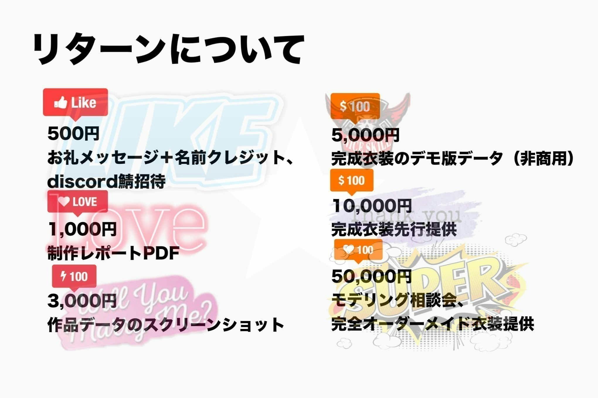 リターンには習得した技術と僕のアイデアで作成したものを閲覧できたり、衣装を提供しようと考えております。