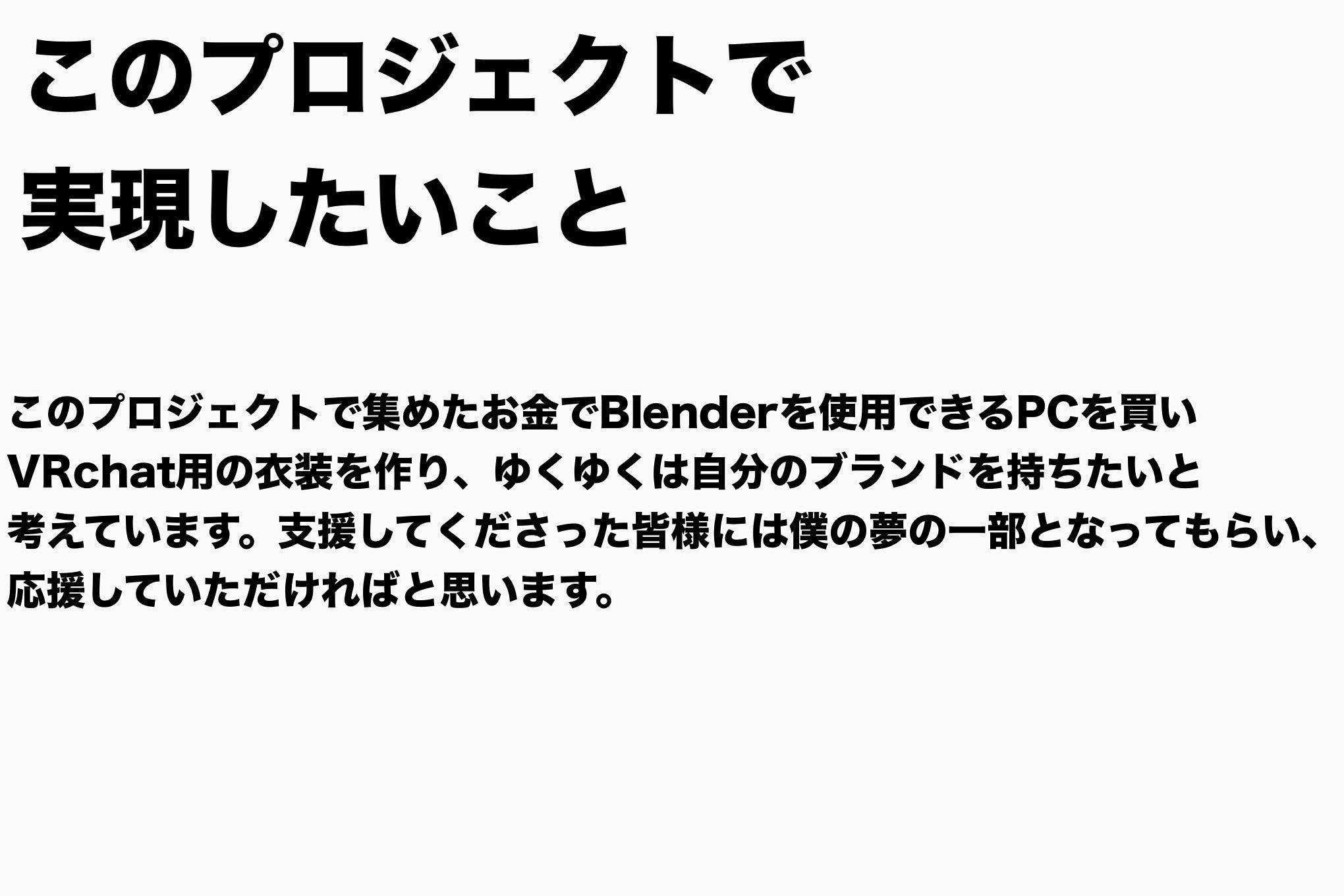 このプロジェクトで集めたお金でBlenderを使用できるPCを買いVRchat用の衣装を作り、ゆくゆくは自分のブランドを持ちたいと考えています。支援してくださった皆様には僕の夢の一部となってもらい、応援していただければと思います。下記は主なこのプロジェクトの目的です
