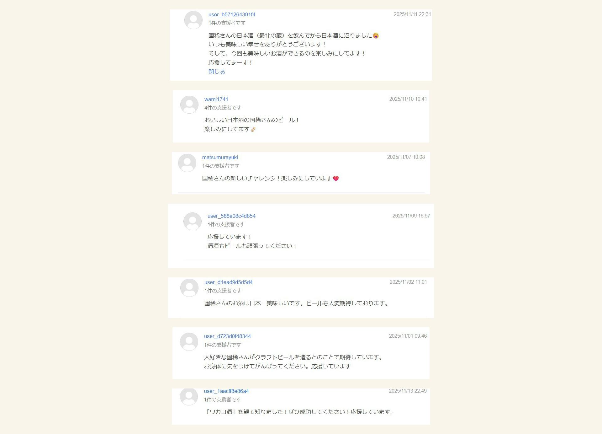 この度は、国稀酒造「千石蔵 CRAFT BEER PROJECT」にご支援を賜り、心より感謝申し上げます。皆様のおかげで大台の100万円を突破いたしました。「先日放送のワカコ酒9でビールのことを知りました。これは応援したい!」「国稀さんの日本酒(最北の蔵)を飲んでから日本酒に沼りました。 いつも美味しい幸せをありがとうございます!そして、今回も美味しいお酒ができるのを楽しみにしてます!」「素晴らしいチャレンジ、来年が待ち遠しいです!」「おいしい日本酒の国稀さんのビール!楽しみにしてます」「応援しています!清酒もビールも頑張ってください!」「微力ですが応援しています!頑張ってください!」お一人おひとりからいただいた温かいお言葉が、私たちの大きな励みとなっております。First Batchの完成、そして千石蔵ビアホールのオープンまで、引き続き温かく見守っていただけますと幸いです。完成の暁には、ぜひ増毛の地で、皆様と乾杯できる日を心待ちにしております。改めて、心より感謝申し上げます。国稀酒造株式会社