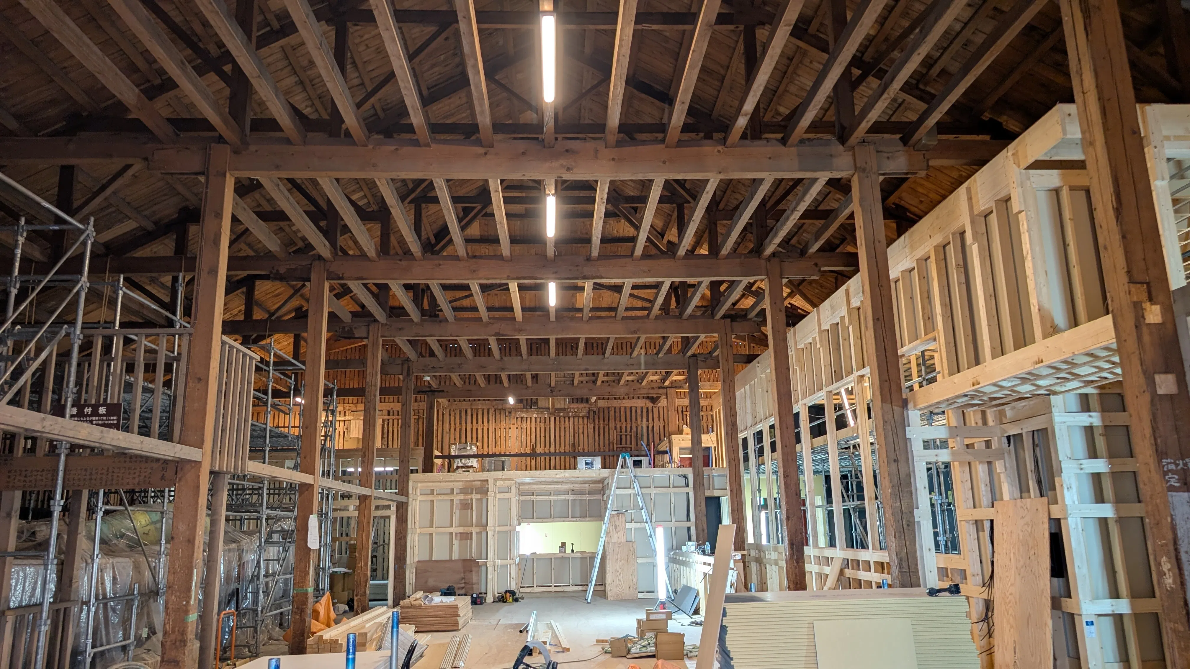 千石蔵では、職人たちの手によって着実に工事が進んでおります。ブルワリー部分(写真右側)は屋根が張られ、迫力ある建物になってきました。