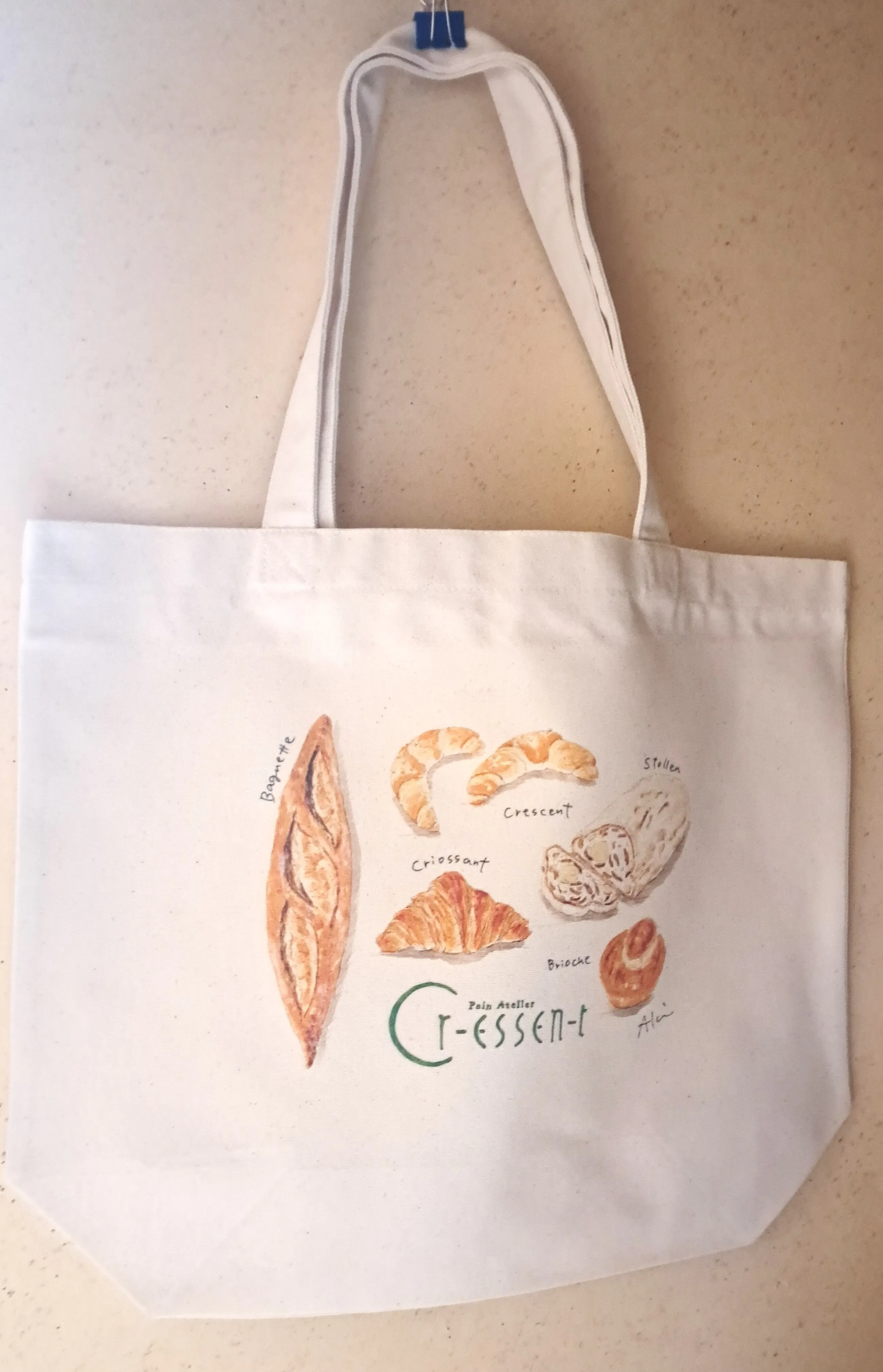 パンがたっぷり入るトートバッグに、当店で実際に焼いているパンのイラストを、パンのイラストの第一人者、秋山洋子さんにお願いして描いていただきます。