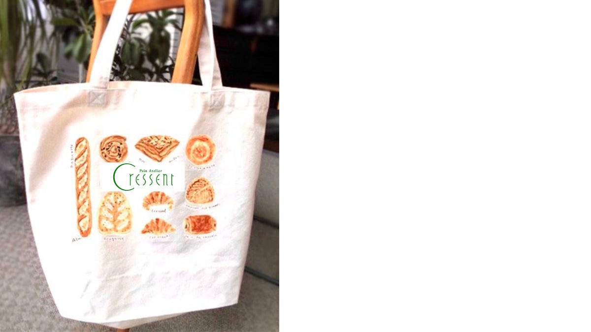 パンがたっぷり入るトートバッグに、当店で実際に焼いているパンのイラストを、パンのイラストの第一人者、秋山洋子さんにお願いして描いていただきます。