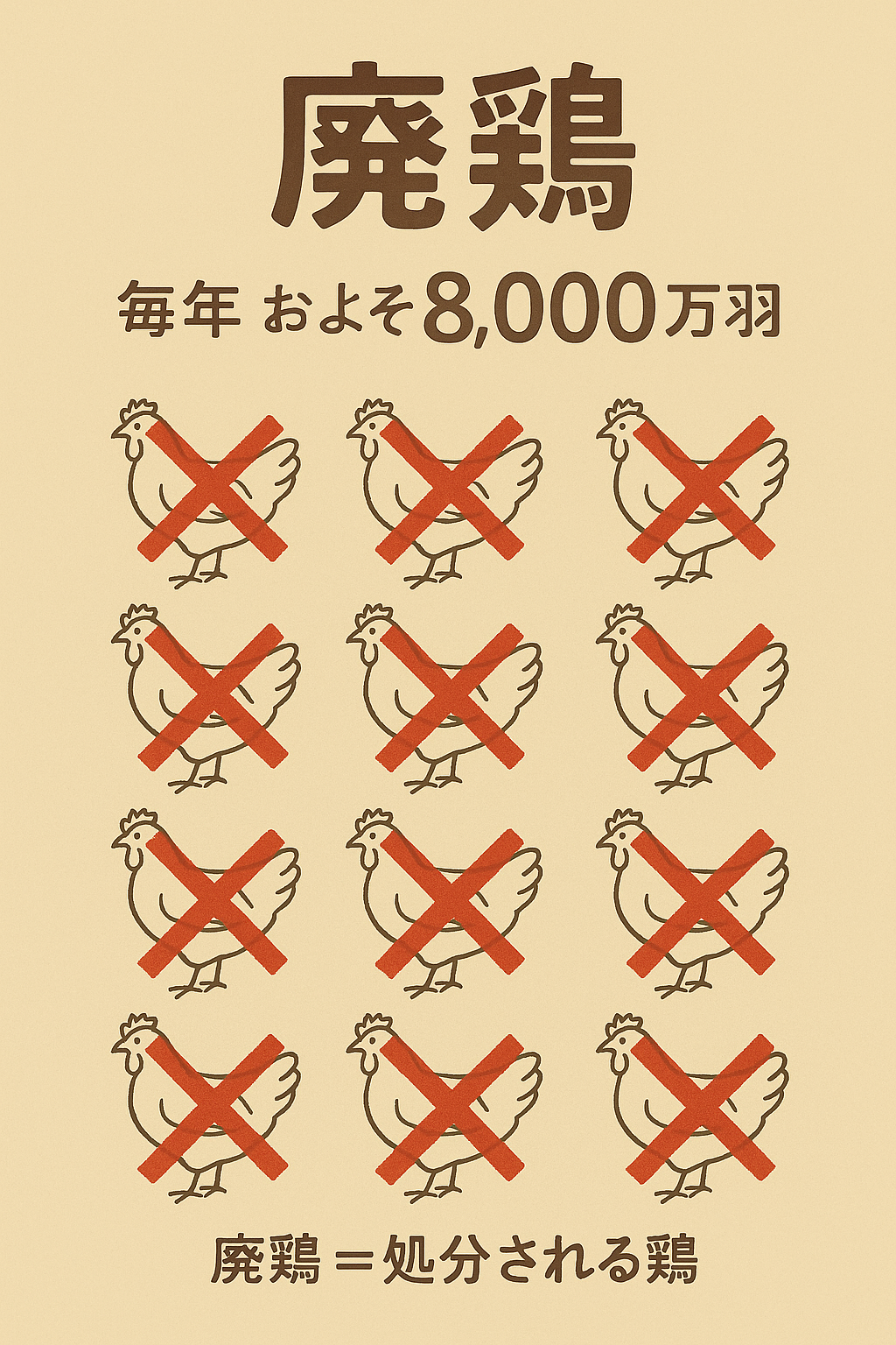 毎年、およそ8,000万羽の鶏が“廃鶏=処分される鶏”として姿を消します。