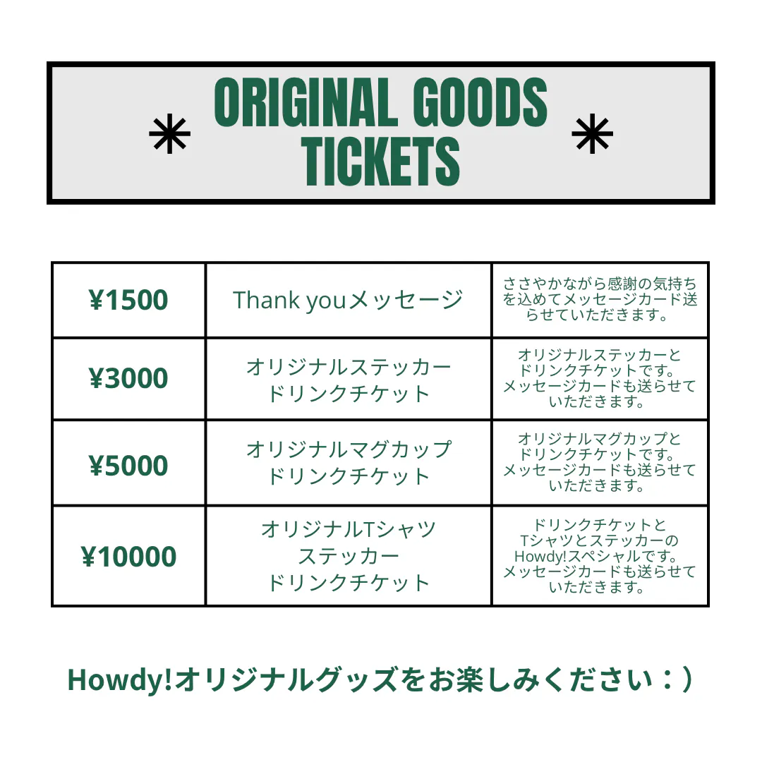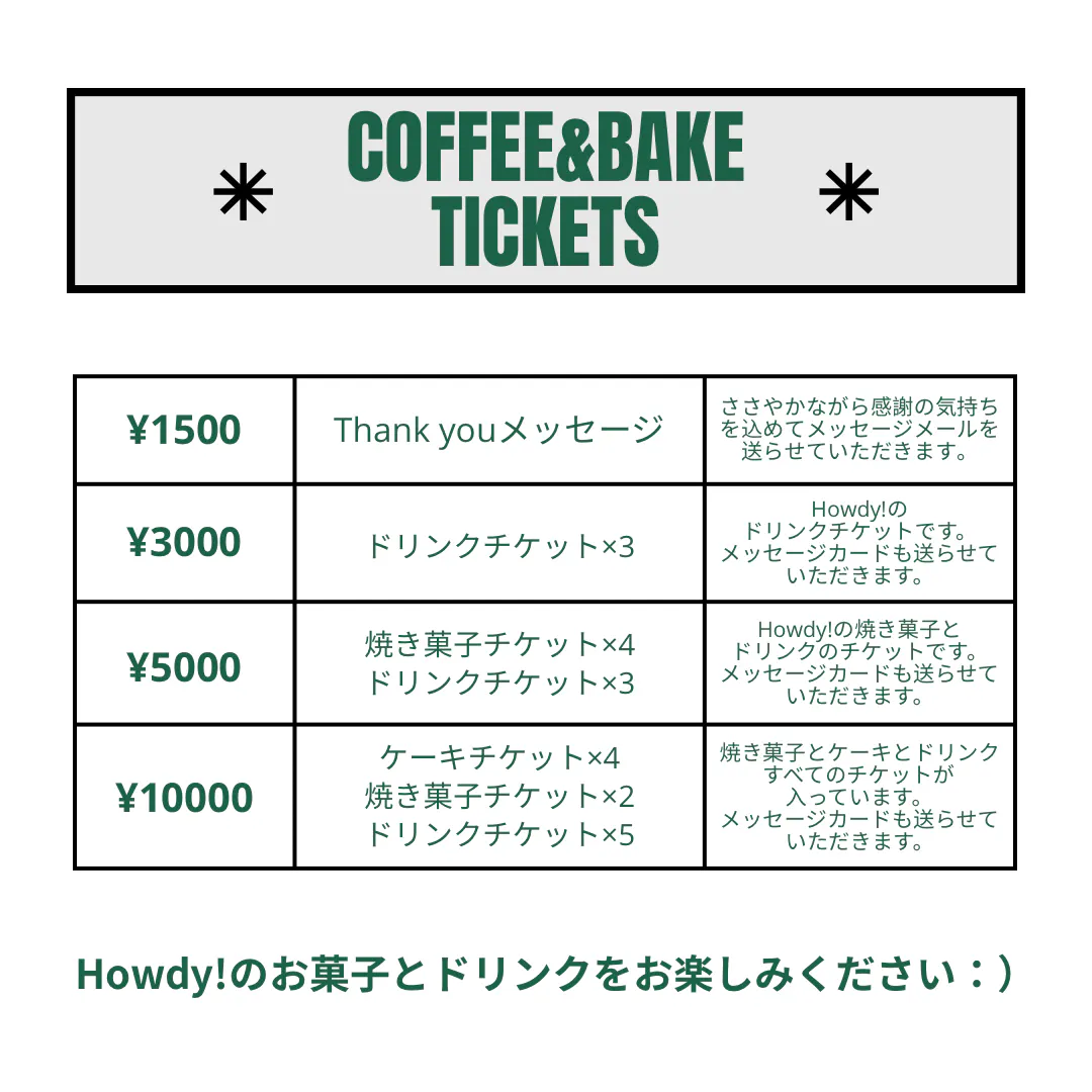 店舗でご利用いただけるドリンクチケット、焼き菓子・ケーキチケット、オリジナルグッズなど、私たちの想いをたくさん込めて精一杯お返しさせていただきます‼