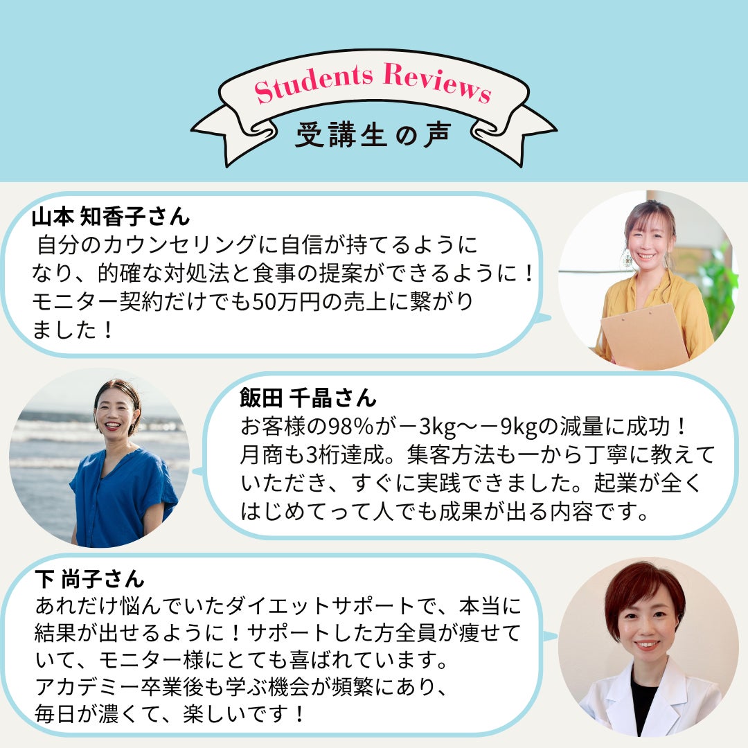 さらに、正しい知識とカウンセリングスキルを持った人材が全国に増えていくことで、誰もが安心して“本当に信頼できる”ダイエットサービスを選べる時代が、きっと訪れると信じています。