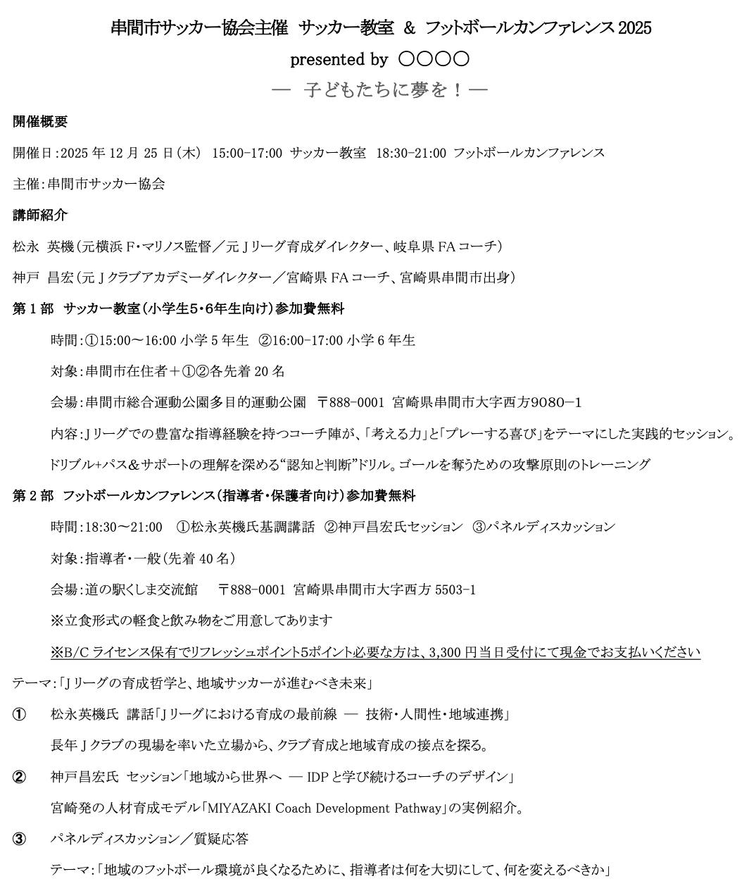 参加費無料のサッカー教室&フットボールカンファレンス。
